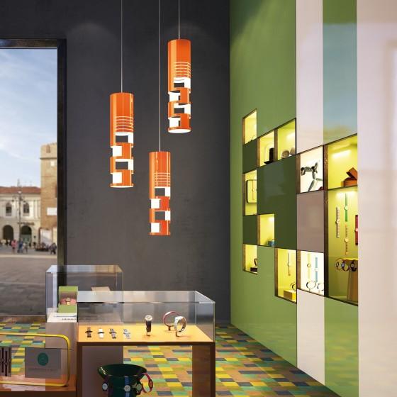 Lend your interiors an awe-inspiring character by imbuing this creatively designed Sama Pendant, specially designed by one of the most prominent artists Gregorio Spini in 2004 for Kundalini. The suspension spot light comes equipped with a two tone co-extruded laser cut premium quality Plexiglas diffuser, which enables the luminaire to emit optimal illumination. Available in both small and medium size, the lamp is a perfect installation for any type of interior space; confined or roomy. Orange, red and fuchsia hues make this lighting fixture compatible enough to suit all kinds of interiors. Last Piece. FLOOR MODEL. Made in Italy.