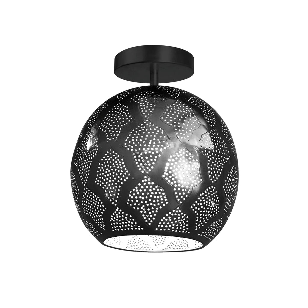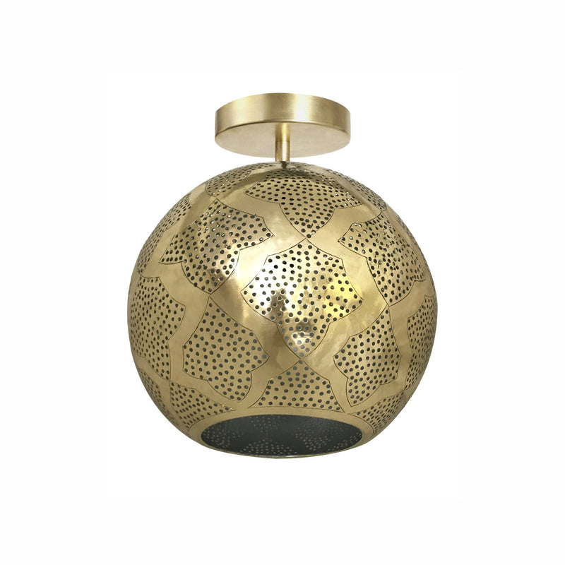 Warda is our modern Moroccan semi-flush light made from semi-precious punched metal and pierced designs. The sphere shape is modern with a hint of mid-century. It's handcrafted by master artisans in the heart of Marrakech, Morocco. The intricate holes create a stunning shadow pattern onto the walls allowing the light to shine through for amazing ambient light. What an amazing way to bring a luxurious global feel in your home and add a touch of the beautiful city of Marrakech.