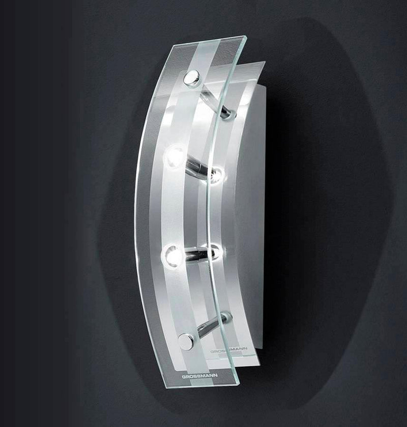 Enliven a mundane indoor setup with the installation of the "ARCUS" Wall Sconce. This ETL-listed and energy-efficient wall lamp is offered by the renowned German brand Grossmann Lighting. This unique modern lighting system features three 20W G4 halogen lamps exuding bright rays of light that pierce through an acid etched curved glass. The glistening metal frame is finished in chrome or to seamlessly blend into any kind of decor. Made in Germany. LAST ITEMS. BRAND NEW.