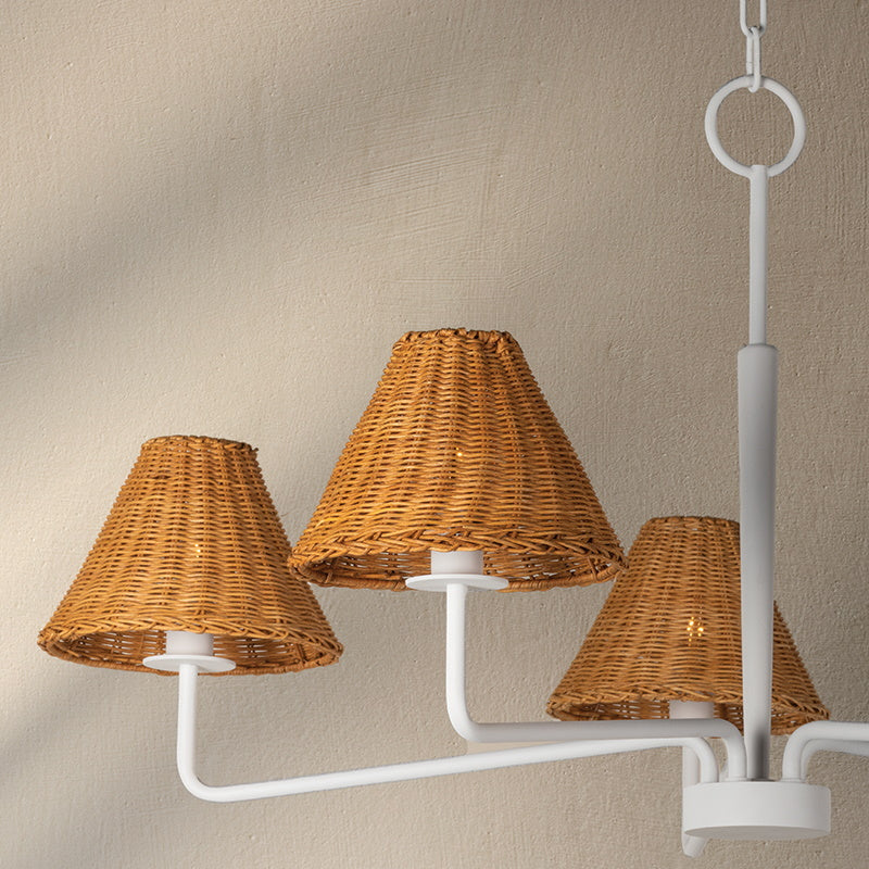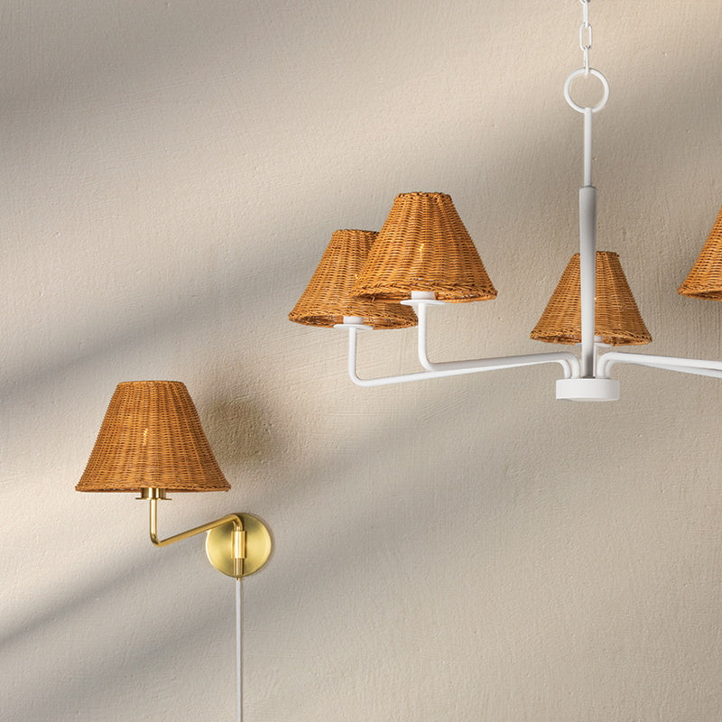 Issa has a natural style that's ahead of the curve. Slender, hooked arms hold a woven rattan shade that lets a soft light filter through. The aged brass or textured white finish is the perfect complement to the natural shade and adds to the fixture's overall earthy feel. Available as a chandelier, wall sconce or portable sconce, there's a place for Issa in every space.