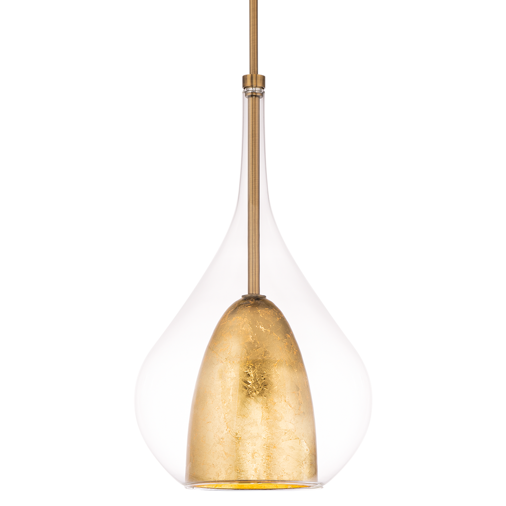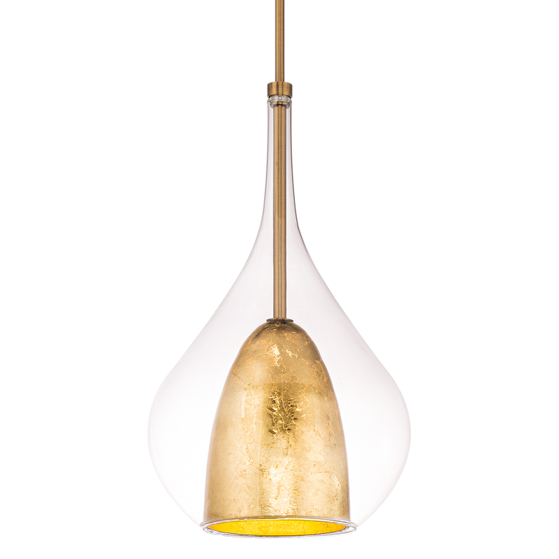 A fresh context with layers of light. A lustrous gold leaf dome suspended within a clear glass teardrop--a seductive shape offering lovely, warm luminescence.