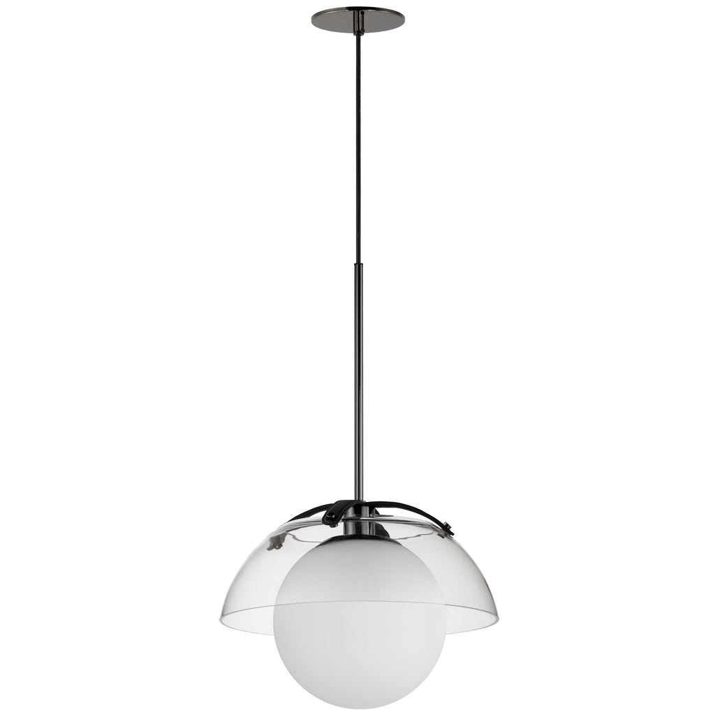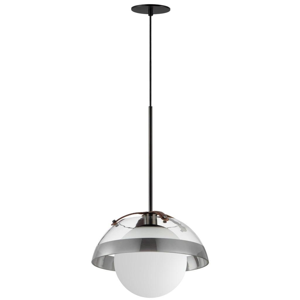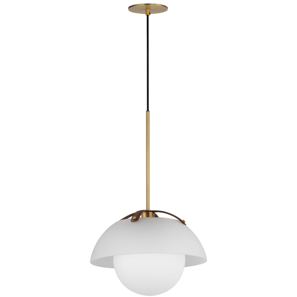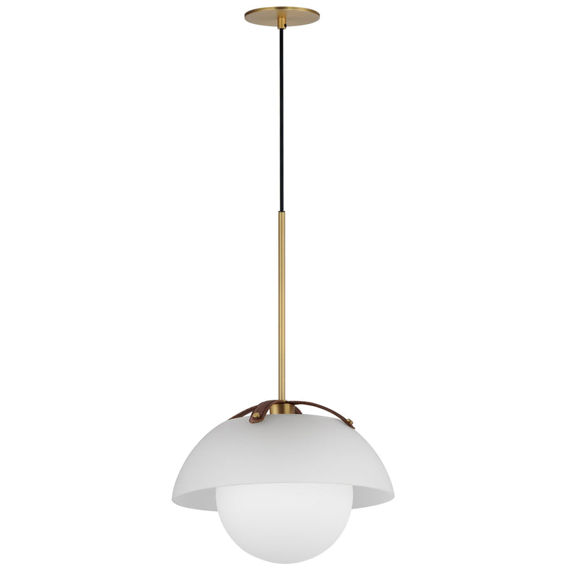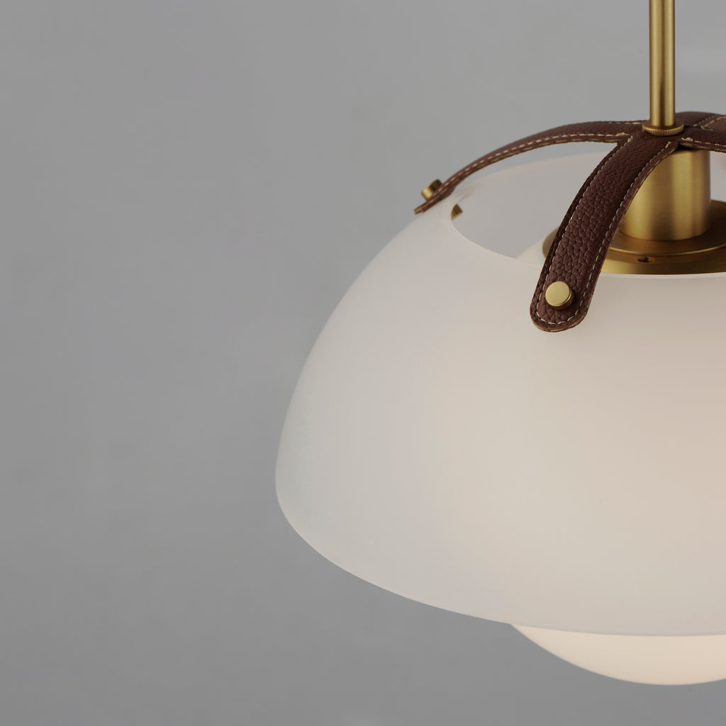 Emblematic of his casual, sophisticated style, Mat Sanders' Domain series include an all-inclusive assortment of applications and finishes Featuring a truncated sphere open at its top and bottom, an internal globe of Opal White glass shades provide ample LED lighting. The outer glass shade is suspended by a strap of stitched leather to compliment the metal finish. Available in acid-etched Satin White glass with Natural Aged Brass, crystal clear glass with polished Black Nickel, or smoke-striped clear glass with matte Gunmetal. The sconces, in consideration of damp locations, have forgone the stitched leather detail. The standout two-light 36" pendant is scaled for island and dining use. Semi-flush mount and complementary sconces round out this collection presenting a complete assortment of ceiling and wall-mounted lighting products suitable for use in bathrooms and other interior spaces. Mat Sanders' diverse period influences have created a fascinating combination of design elements.