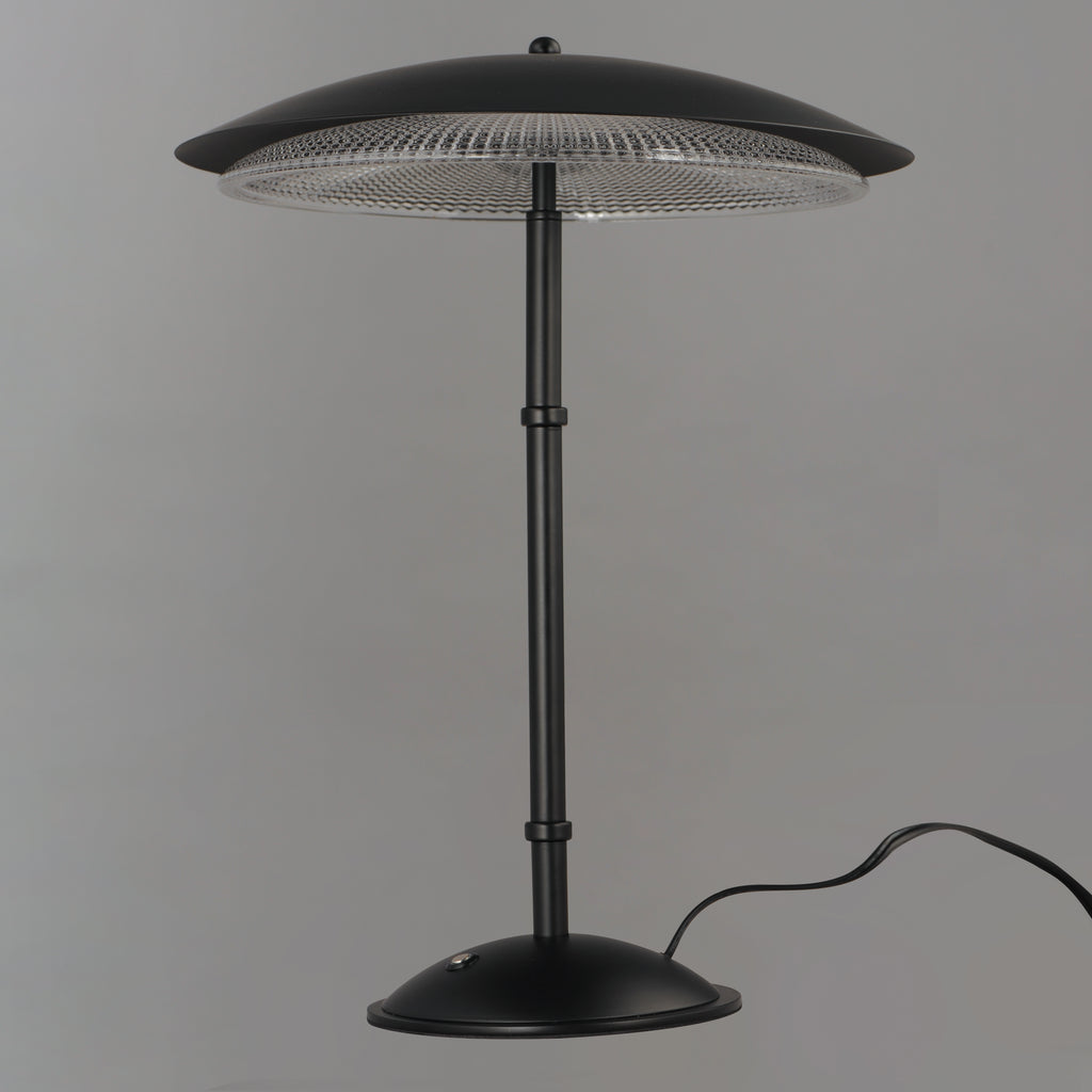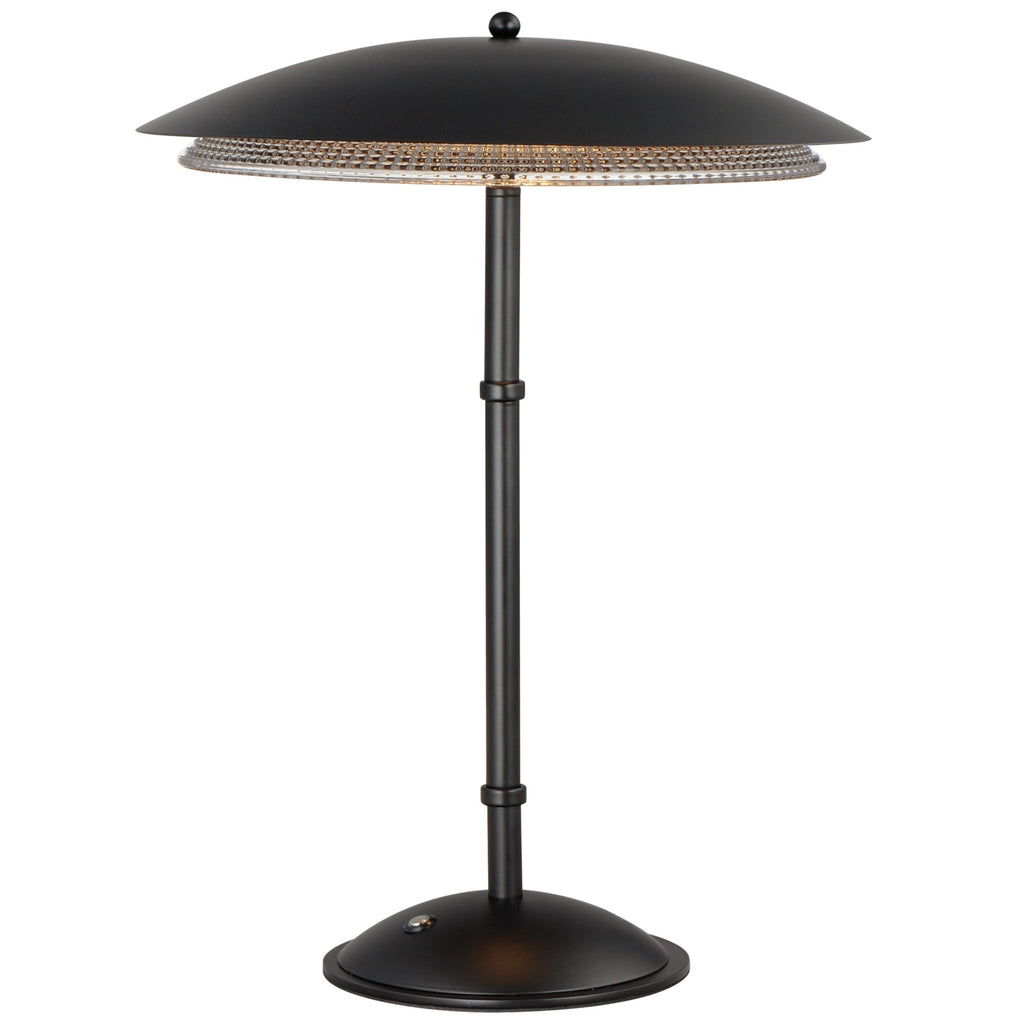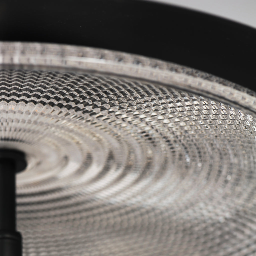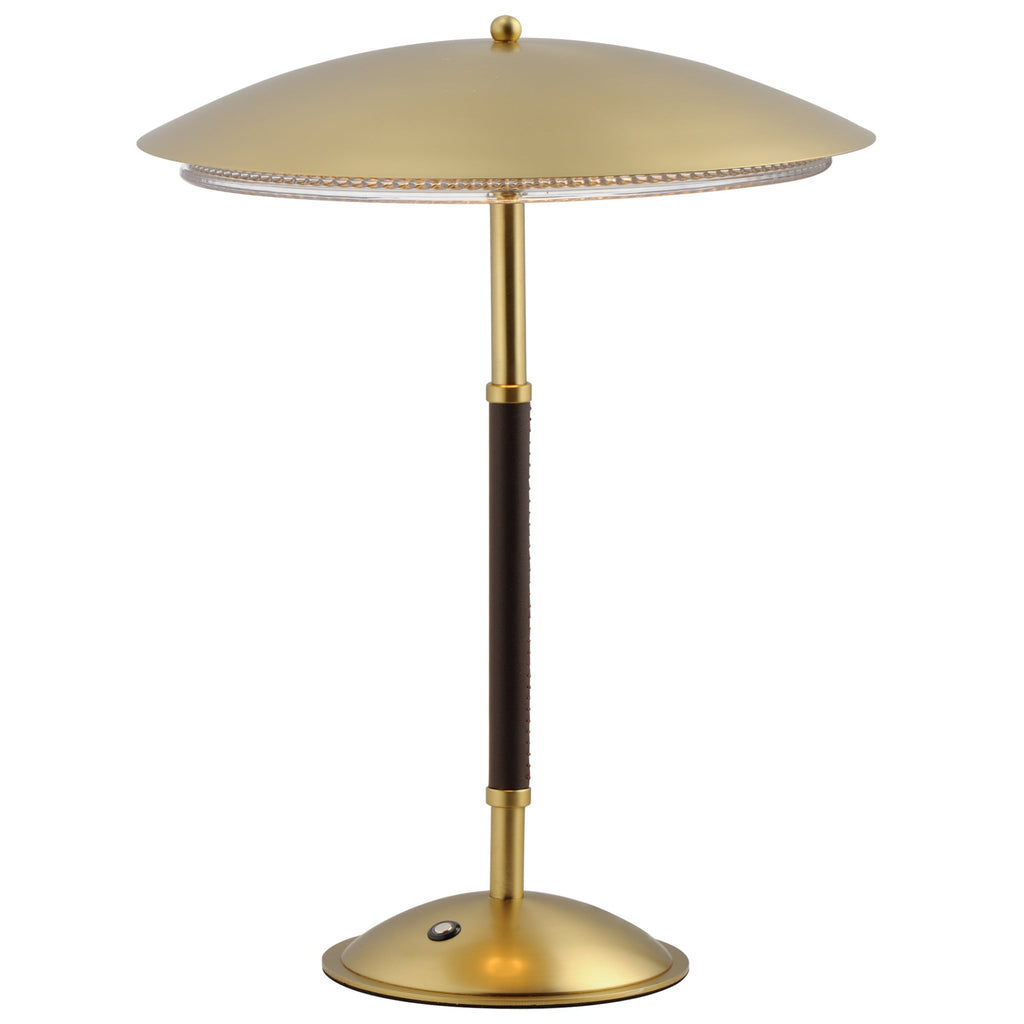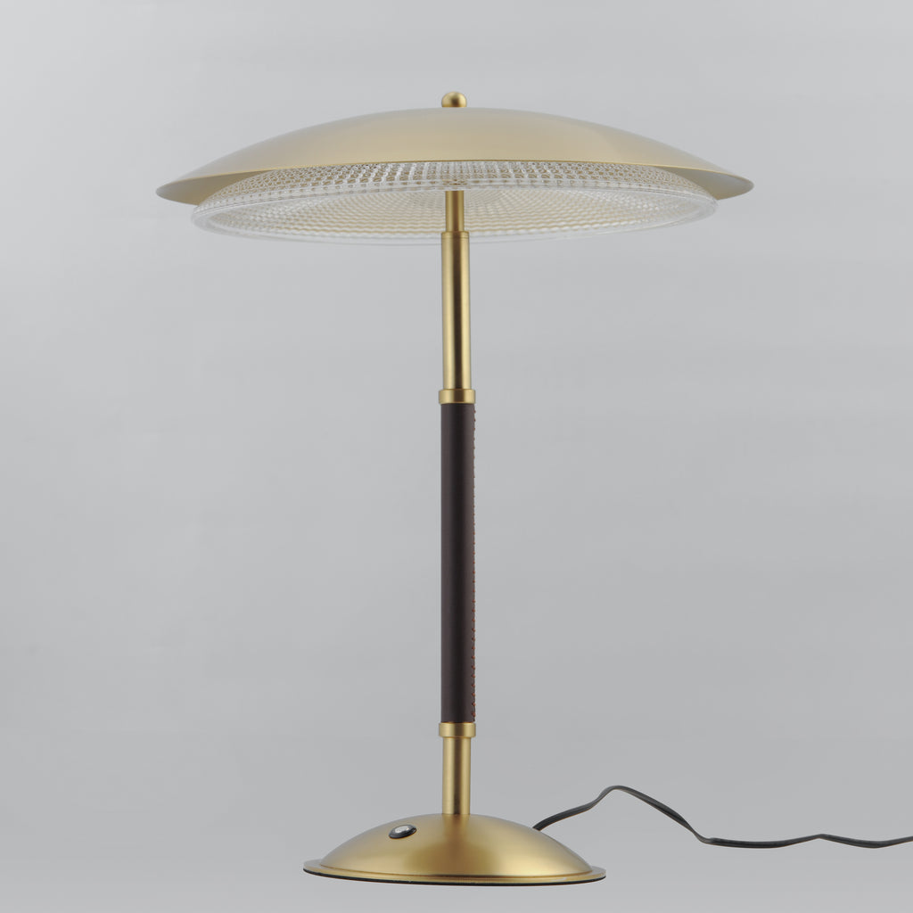 Somewhat recessed within a classic Mid-Century metal shade, a secondary thick glass shade pressed with prismatic patterns casts an iridescent light. The dedicated LED light source is concealed to reduce glare while providing ample lighting. Choose from large, thin-profiled cymbals of Brass with Dark Brown leather accents or Midnight Black metalwork with Black pebbled leather wraps stitched onto the frame. The Prismatic series of pendants, low profile surface mounts, and portable lamps incorporate advanced LED technology. A convenient touch dimmer on the base of the portable lamps features 3-step dimming allowing you to control the light settings for ambient or functional uses.