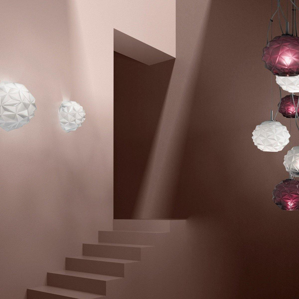 Transform the dynamics of any living space by installing the Emisphera Wall Light. A stylish wall light that represents the unique features of elliptical globes. It has a textured surface that is categorized by multiple facets. It can be a striking addition in the living room, bedroom, dining room or hallways. This stylish light accessory in polish chrome finish comes in small and large sizes. This light fixture is available in from various color options that include amethyst, milk white clear, clear, blue denim, smoked, grey, ocean, and topaz.