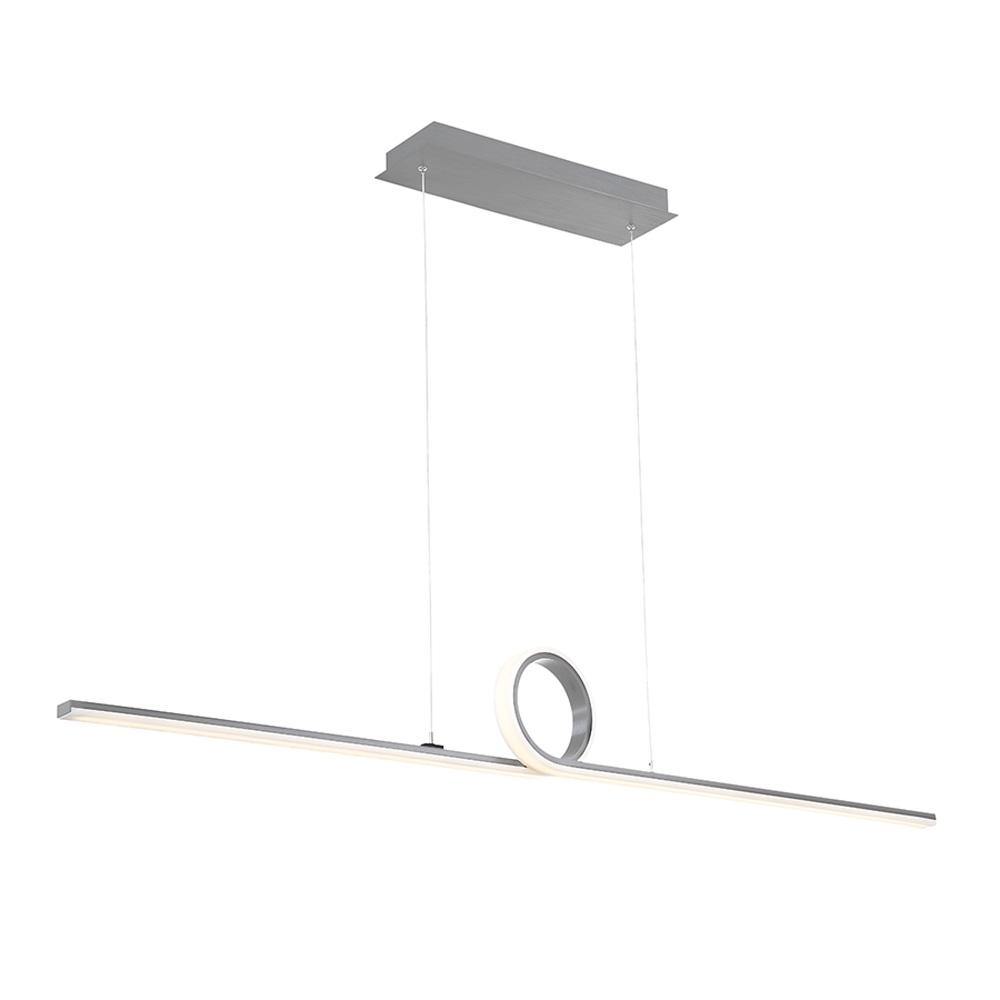 The Loophole dweLED Pendant by WAC Lighting is a modern light fixture that comes in brushed aluminum and black finishes. This luminaire has a flexible composite diffuser with a center loop design. The light fixture with 3000K color temperature and 90 CRI illuminates the surroundings. The fasteners maintain tension to hold fixture level. It is fixed to ultra-thin powered cables that make it possible to suspend this luminaire easily from the ceiling.