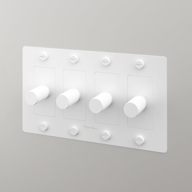 A 4G solid metal dimmer switch with a diamond-cut knurled knob to feel amazing with every touch. The dimmer is finished with a flat plate and our signature solid metal coin screws. Available in five different finishes. You can also team them up with our toggle switches, duplex and USB outlets in matching finishes.