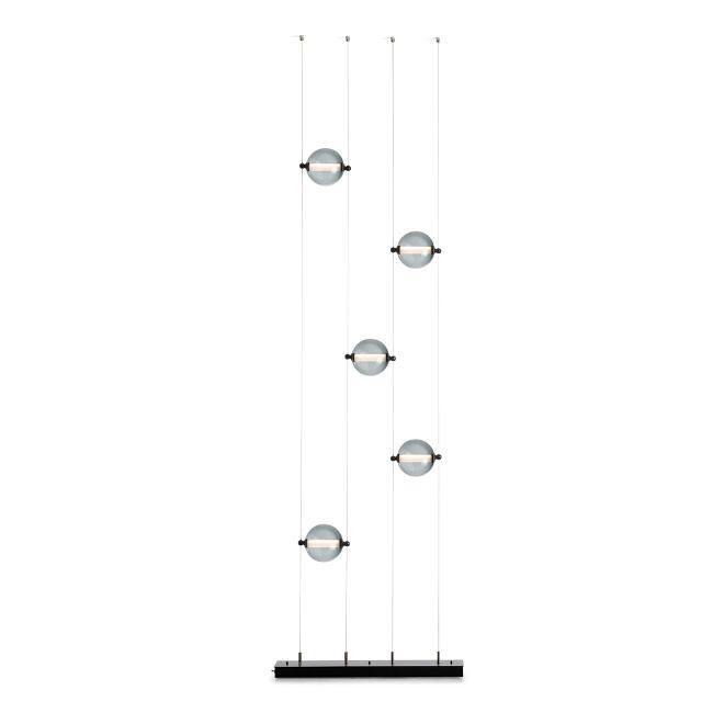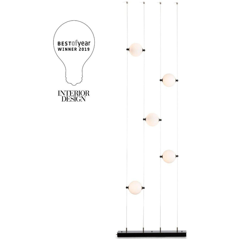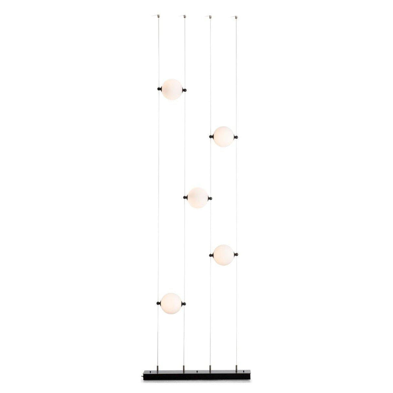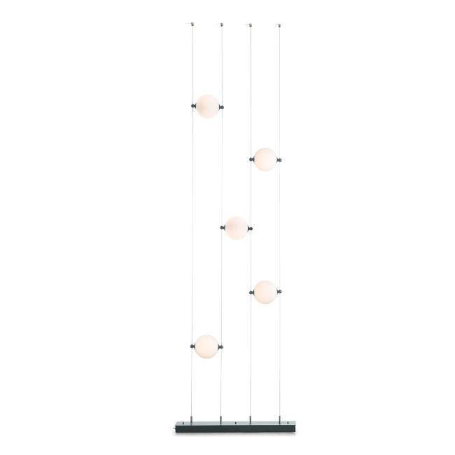 Rave reviews from designers accompanied the introduction of the Abacus 5-Light Floor-to-Ceiling Plug-in LED Lamp. An extraordinary piece of illumination, the Abacus, true to its namesake, allows for exceptional customization. Its five blown glass globes can be moved up and down their low-voltage cable "rails", by virtue of tiny grippers on each side that allow the globes to be positioned at will. With tiny ceiling anchors for stability, this Abacus Floor lamp can be plugged in to any grounded 3-prong outlet.