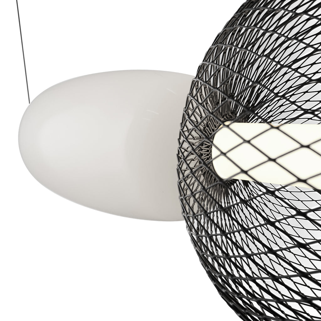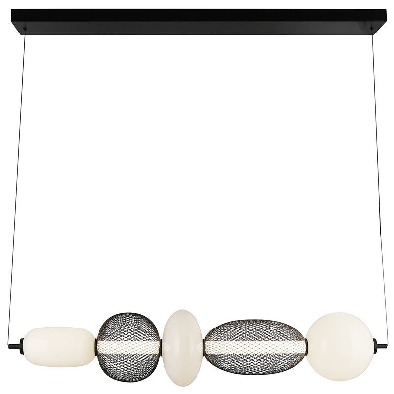 Elevate your space with the sophisticated charm of the Ace LED linear type chandelier. This masterpiece combines an opulent white glass shade with a bold black mesh design, encasing a radiant LED tube that casts a warm, inviting glow. Its rich black metalwork and adjustable wire offer timeless elegance with versatile functionality, making it a perfect centerpiece for any setting.