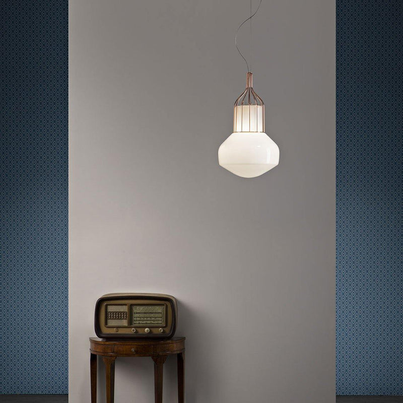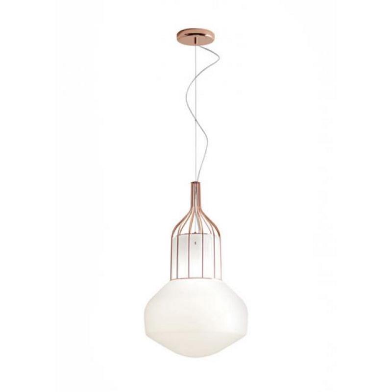 The Aerostat Pendant by Fabbian has a lovely translucent pendant having a lightweight appeal. Over the pendant, there lies a metal cage like structure in black, chrome and copper finish. This metal structure accentuates the glass shade. It looks beautiful in your living room, bedroom, kitchen or office. The light source is fixed in an E26 base and is an ideal option for ambient lighting. This pendant is available in both small and large sizes and comes with a Triarc dimmable.