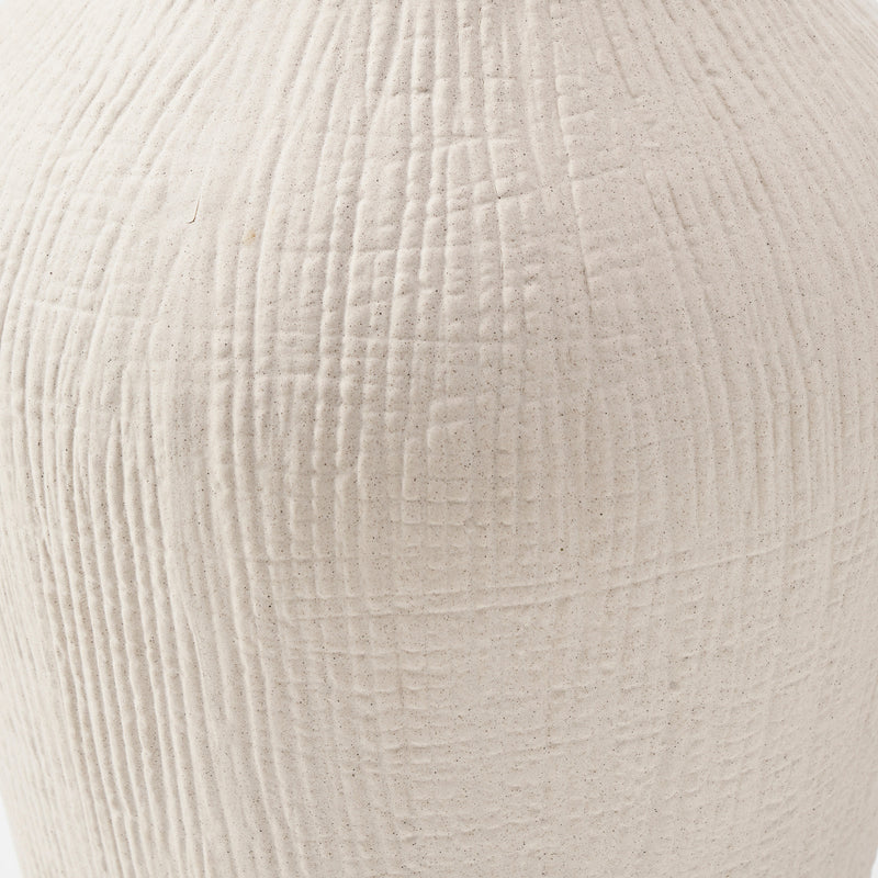 Ceramic stoneware takes on an earthy, organic appeal thanks to subtle textured details surrounding its structure. Thanks to a matte ivory finish, it holds an ethereal energy that only grows because of its curved shape. Placed within the classic or contemporary living space or dining room, it can hold its own alone or act as a vessel for bouquets.