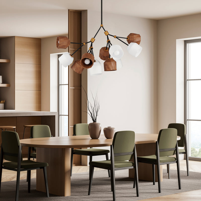 This stylish modern chandelier combines solid wood shades with warm bronze and brass tones for a striking, transitional look. Featuring arms akimbo, the design pairs walnut-stained oak with Satin White glass shades, offering a sophisticated blend of materials and providing glare-free, ambient lighting. A coordinating swing-arm wall sconce extends horizontally with a sturdy, attractive arm structure. A simpler two light wall sconce also pairs well with the collection. Finished in a two-tone Dark Bronze and Antique Brass, and complemented by the natural wood tones, this collection easily blends with a variety of styles. LED lamps are included with each fixture, ensuring energy efficiency and convenience.