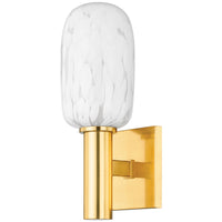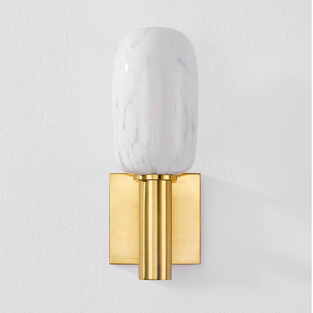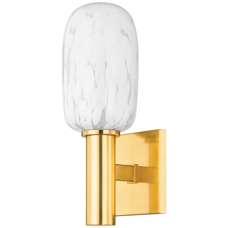 Even as a simple sconce, Abina makes an immediate statement with its whimsical silhouette and elevated materiality. The Nuage Glass shade features whimsical white speckles captured in clear glass that create a celebratory appearance. Finished in sleek Aged Brass, the backplate and post of Abina offer a moment of tailored clarity that balances the playful shade.