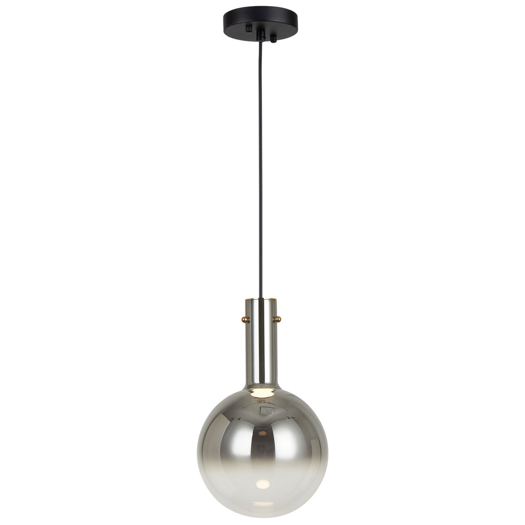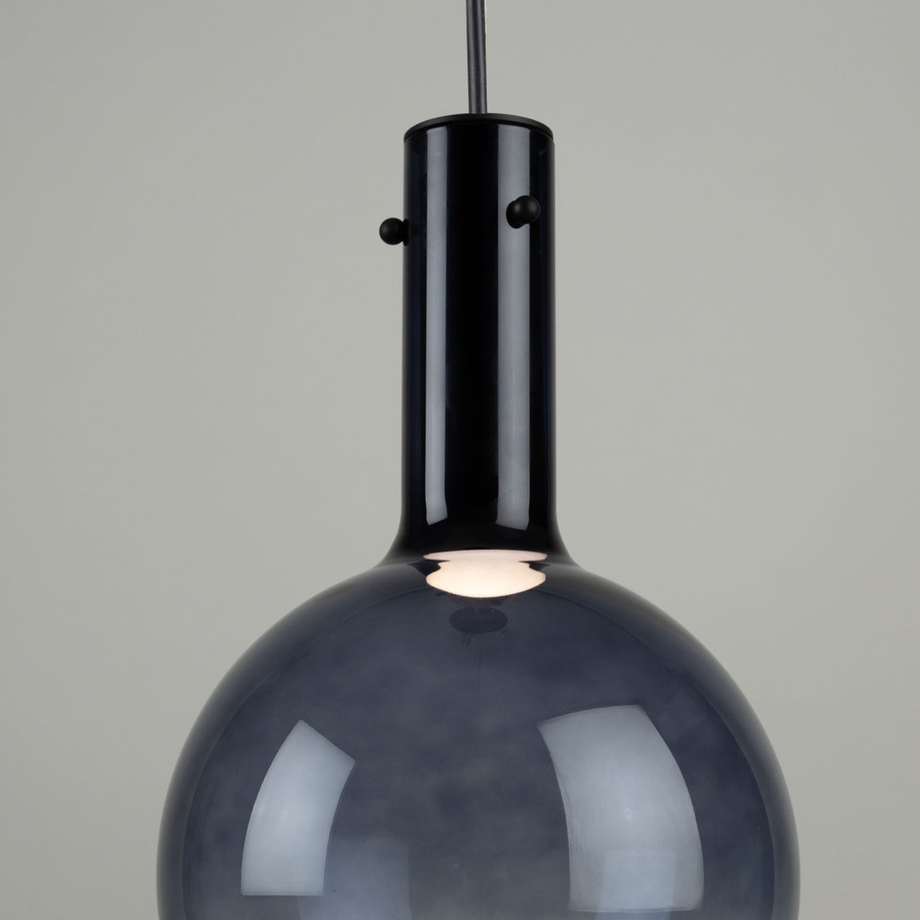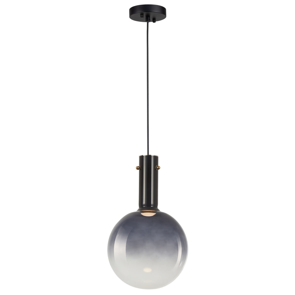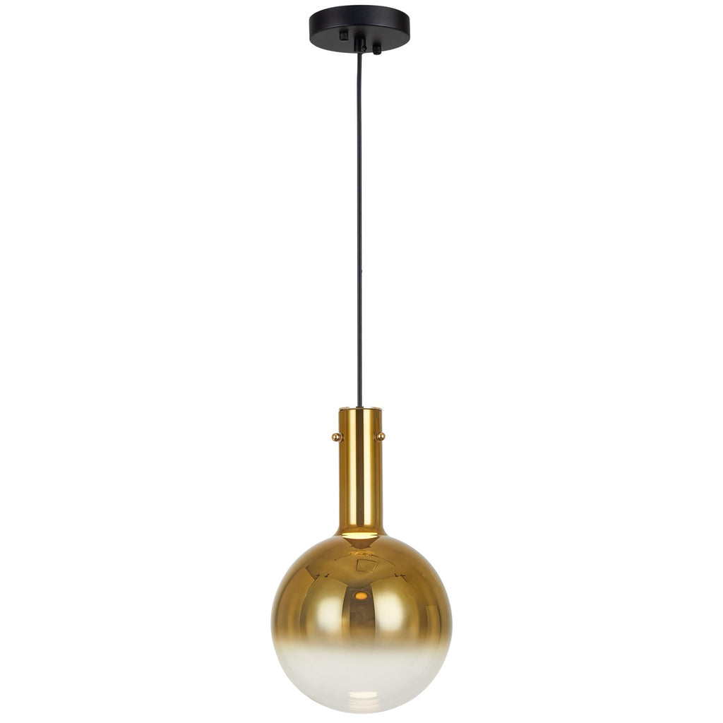 The Alexis pendant collection showcases a stunning design with spherical ombre-type glassware, featuring a captivating gradient of color that transitions seamlessly from vibrant hues at the top to a clear bottom. The Alexis is enhanced by energy-efficient LED illumination, providing a contemporary and visually striking addition to any space. Shown in blue (also available in gold, coffee, or chrome). (Easily height adjustable)