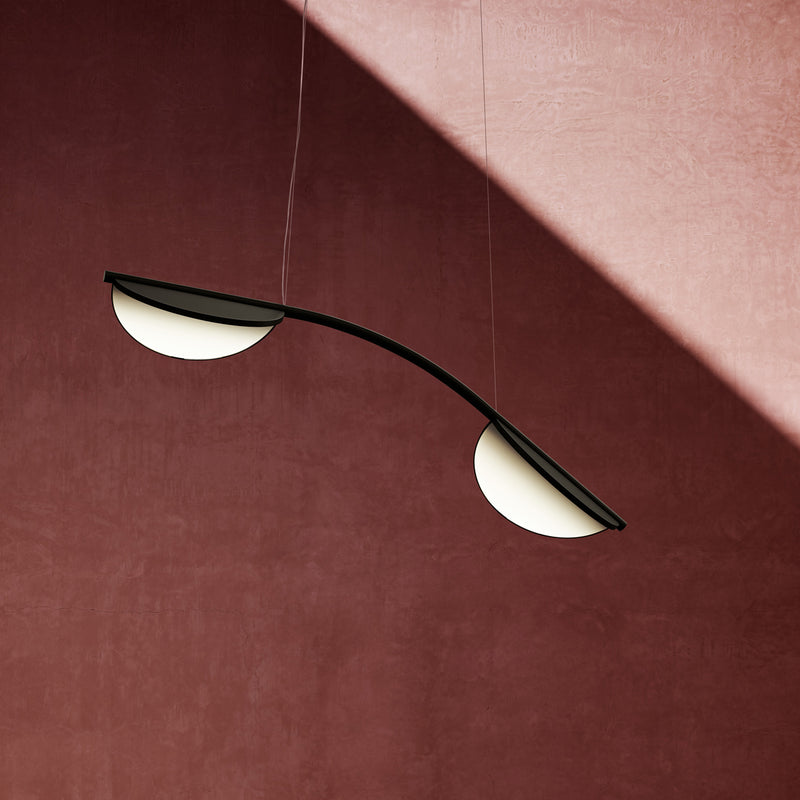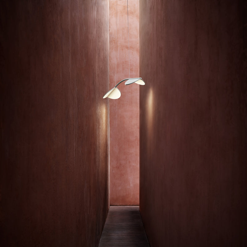 Suspension lamp with diffused light emission available in linear and organic compositions. Tubular structure made of aluminium and CNC aluminium terminals with matte or metallized finish. Edge Lighting technology integrated. Light units can be turned by steps of 60º within the structure in order to change the direction of the light emitted. Metal rosette with matte white finish. The integrated electronics in the ceiling rose allow the use of different dimming systems: 1-10V, DALI, push-dim or potentiometer. Useful length of the cable 3 mt. The product has been designed according to the ISCC standards and it is assembled with total absence of glued components so that it can be completely separated for future recyclability.