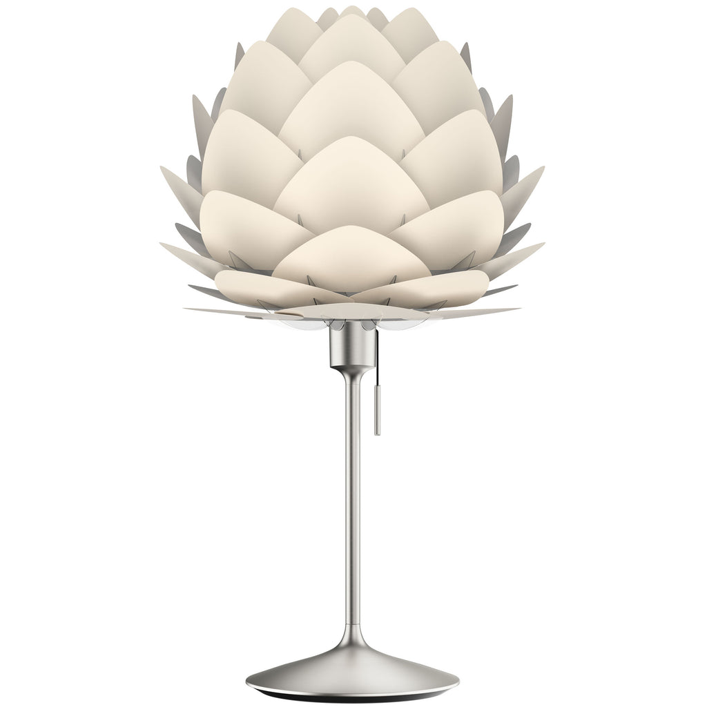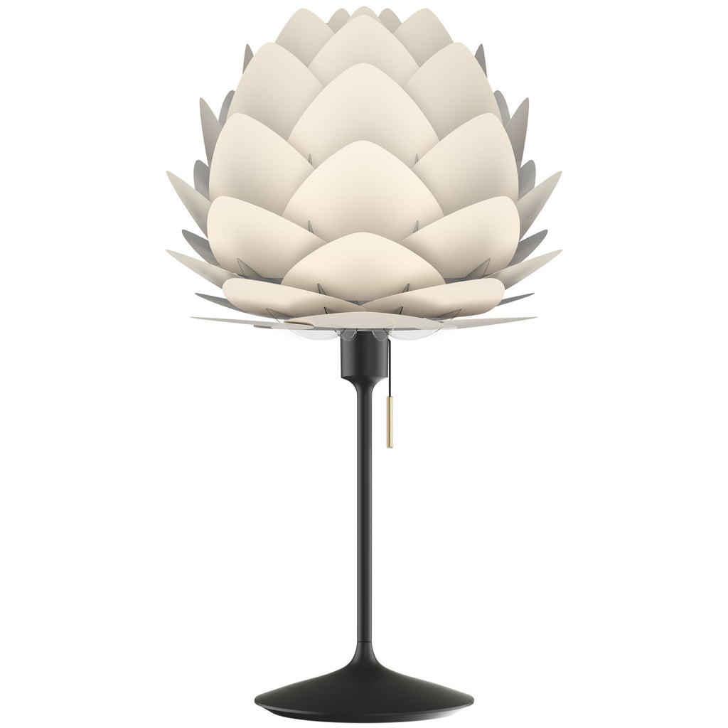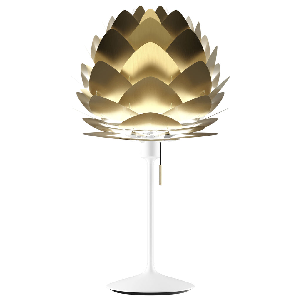 The products of the Danish brand UMAGE, founded in 2008, can be found in more than 40 countries around the world. The brand's unique Scandinavian style combines the highest functionality, simplicity and beauty to provide remarkable furniture and lighting. UMAGE products are inspired by the raw, Nordic landscape, additionally out of concern for the environment, the whole activity of the company, from production to delivery is well thought out and planned to be as sustainable as possible.The Aluvia Table Lamp features an eclectic shade constructed from aluminum leaves. Its sculptural form evokes an enchanting flower with a modern, geometric edge and sits atop a delicate base reminiscent of a champagne flute. The base contains a USB charging port that allows devices to be charged even when the lamp is off. On/off pull chain located on socket.