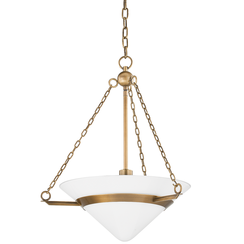 Amador takes the classic pendant form and gives it a modern vibe. An opal glossy shade is beautifully suspended in a cradle of patina brass. The angled, linked arms and cone-shaped blown glass create a sense of drama and add to the fixture's overall edginess. Available in a 15" or 20" size, this versatile pendant brings style and sophistication to any space.
