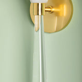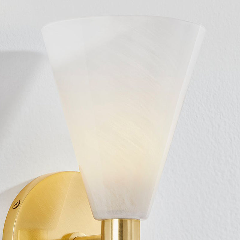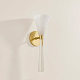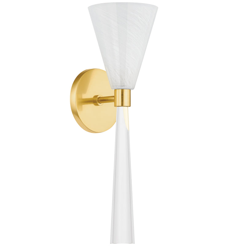 Amara is a timeless beauty with an abstracted botanical motif. Representing a bloom, an inverted cone-shaped shade is formed from Cloud Glass and etched internally to enhance its texture. A sparkling crystal stem adds an upscale touch that reflects light. Supported by a circular Aged Brass backplate, this serene wall light is ideal for illuminating small spaces, like a bathroom, bedside, or hallway.