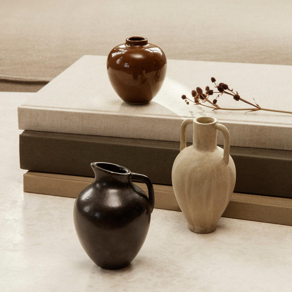 Reminiscent of ancient Greek vases, the petite, ceramic Ary Mini Vase comes in a selection of distinctive shapes. Varying in size, colour and glaze, each has its own personality and unique expression. Use the Ary Mini Vase in a small, decorative still life with other vases from the series or alone with single stem flowers.