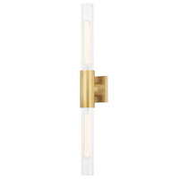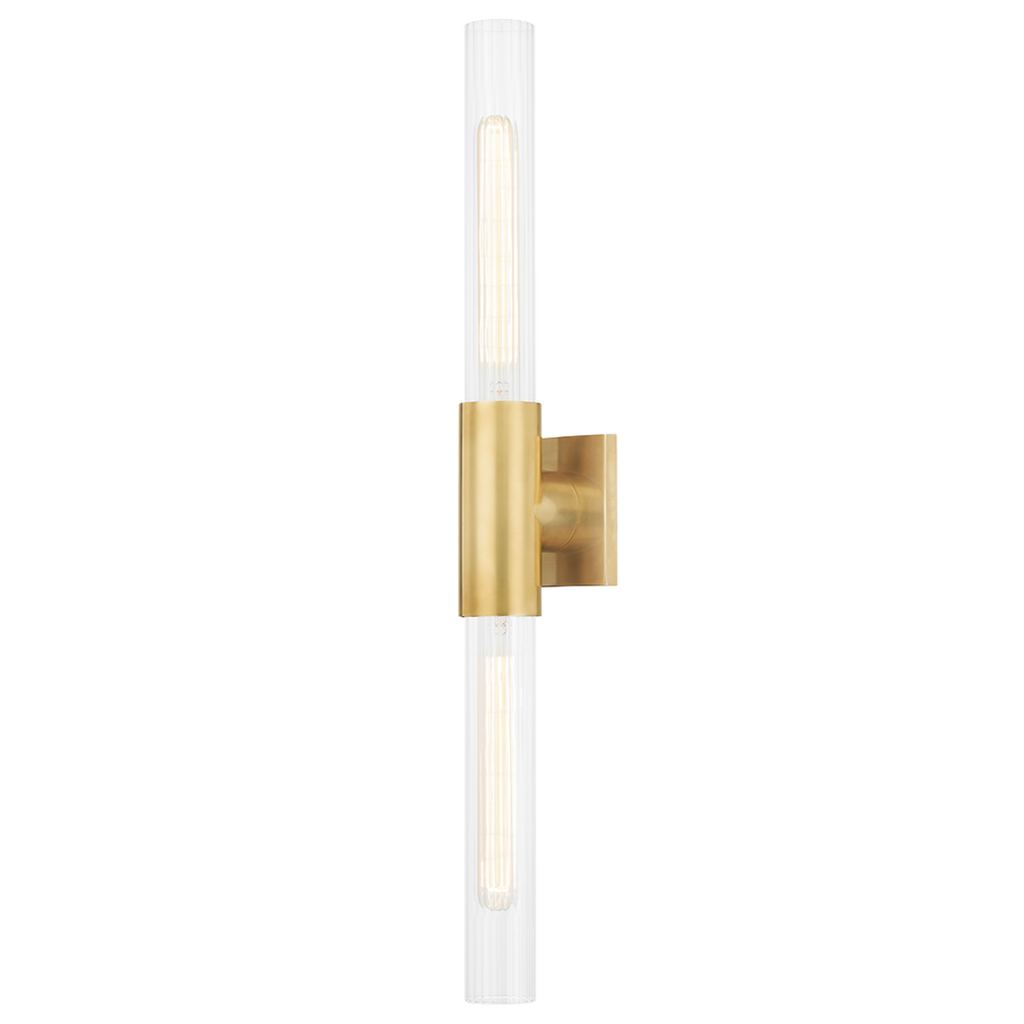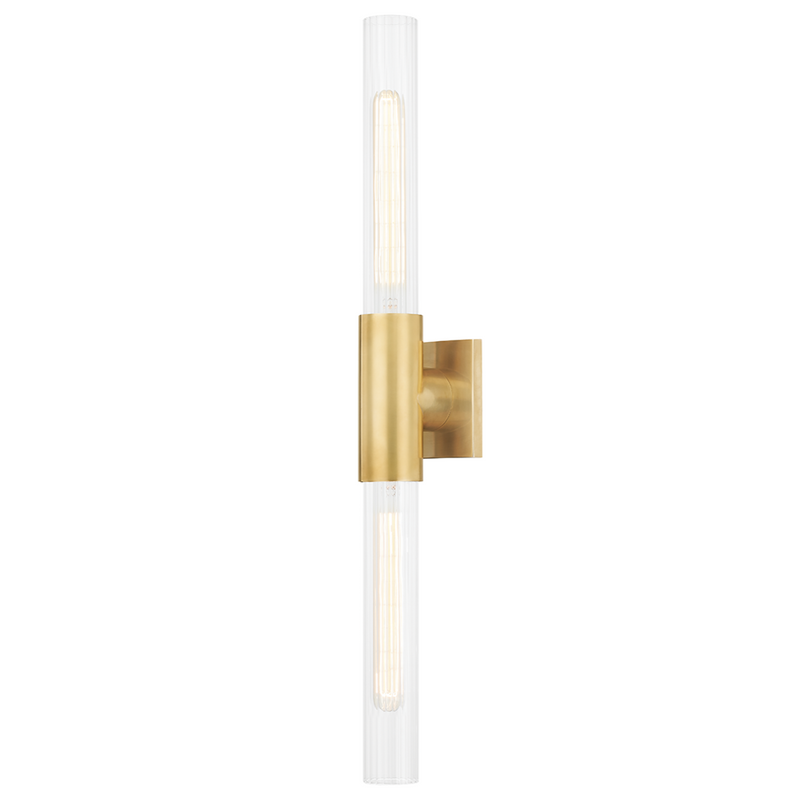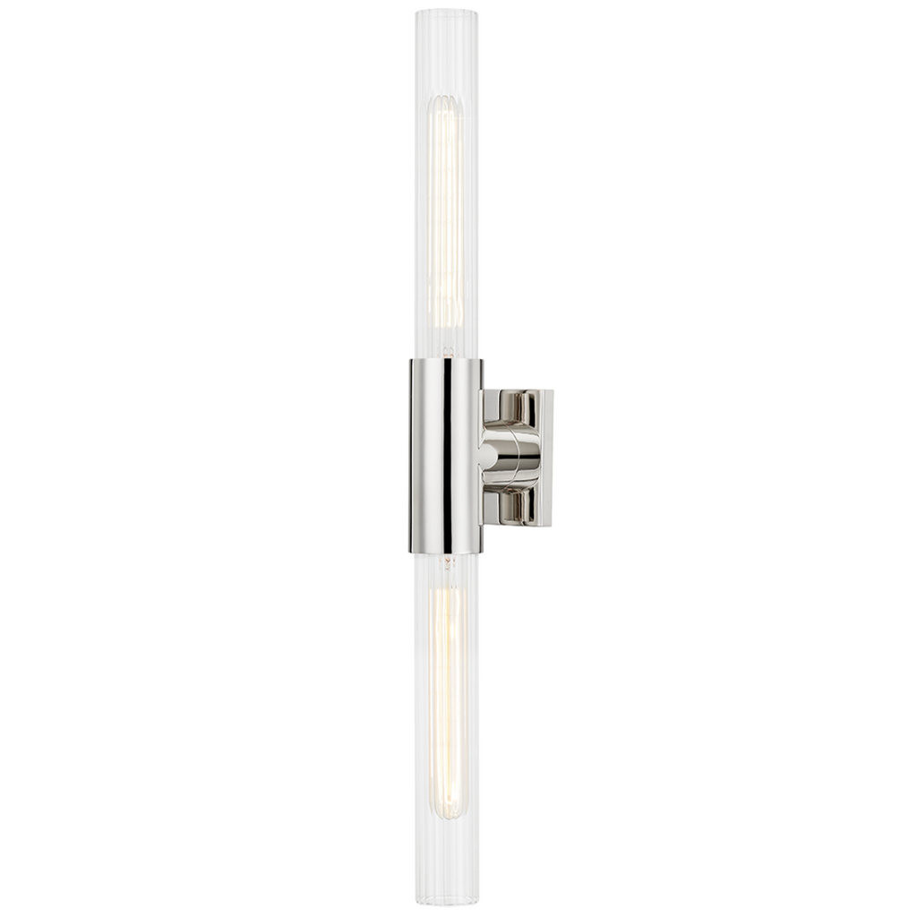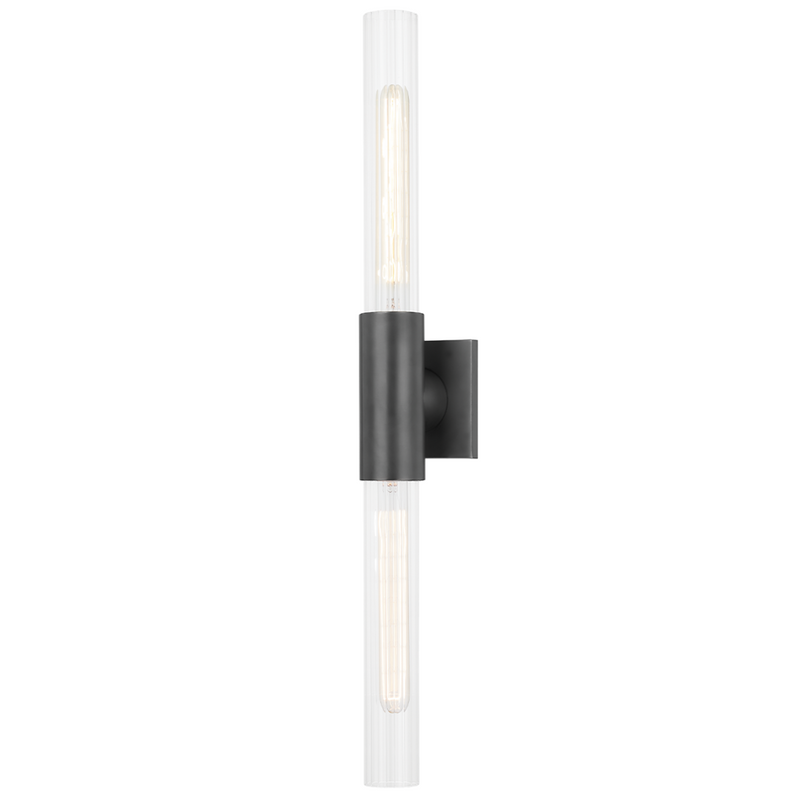 Asher's stark, square backplate and thick, sleek arm have a utilitarian vibe while the ribbed, clear glass cylindrical shade gives the fixture a warmer, textural feel. Light from the incandescent bulb reflects beautifully through the ribbed glass shade. Available in Aged Brass, Old Bronze and Polished Nickel.