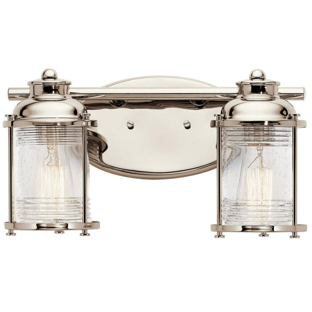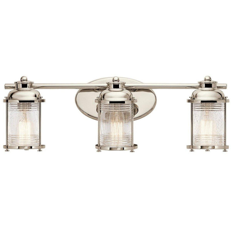 This striking bath fixture has a glossy polished nickel finish that brings a nautical feel to your bathroom. It comes with hanging incandescent lamps designed in a lantern style diffused with transparent seeded glass shades. A 9" wide and 5" high oval backplate contributes to its vintage look. This fixture has steel construction for an added durability. The positioning is made easier as the height from the center of the wall opening is 2.50". The Ashland collection has two, three, and four-light fixtures that enable you to pick one according to the size of your bathroom.