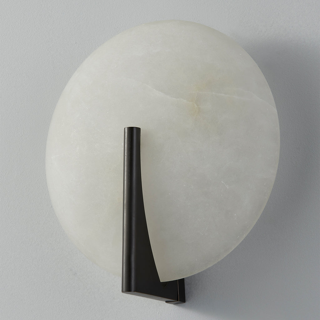 Asteria's shallow bowl-shaped alabaster shades are held in place by a single piece of Vintage or Black Brass metalwork. The alabaster gives off a delicate, moon-like glow when lit. This simple, refined sconce works well in many rooms of the home, including the bath.