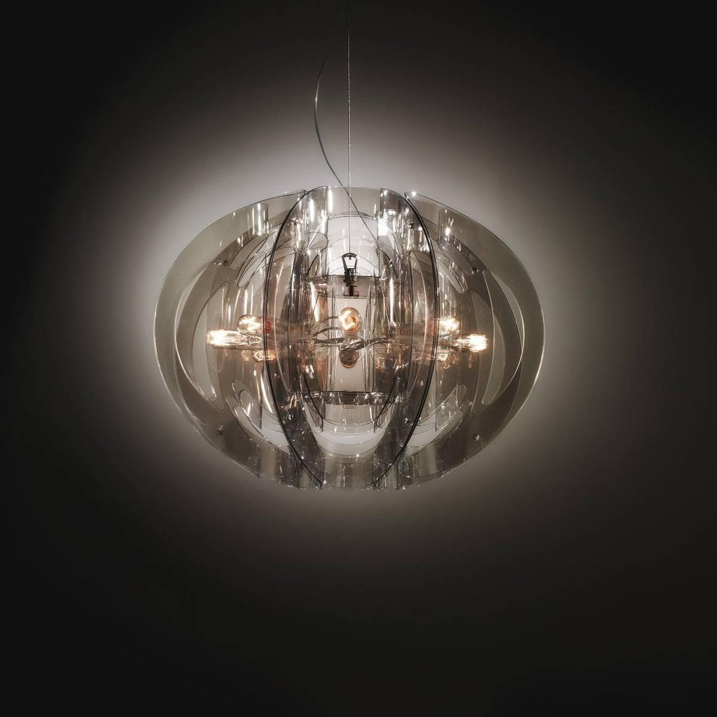 Hanging down a round metal canopy with the help of two wires, the Atlante Suspension light seems to be coming straight from the outer space. This suspension light features a multi-layered Cristalflex material construction, with a soft dove-grey finish. It sports a spherical shape formed by creatively folded and inter-connected innumerable sheets of the Cristalflex. These reflective layers house eight Halogen bulbs, to give way to an impressive 360 degrees, diffused light effect that is sure to take anyone by a surprise. The Atlante Suspension Lamp, in pleasing fume color, is perfect for use in corridors, dining halls and study area.