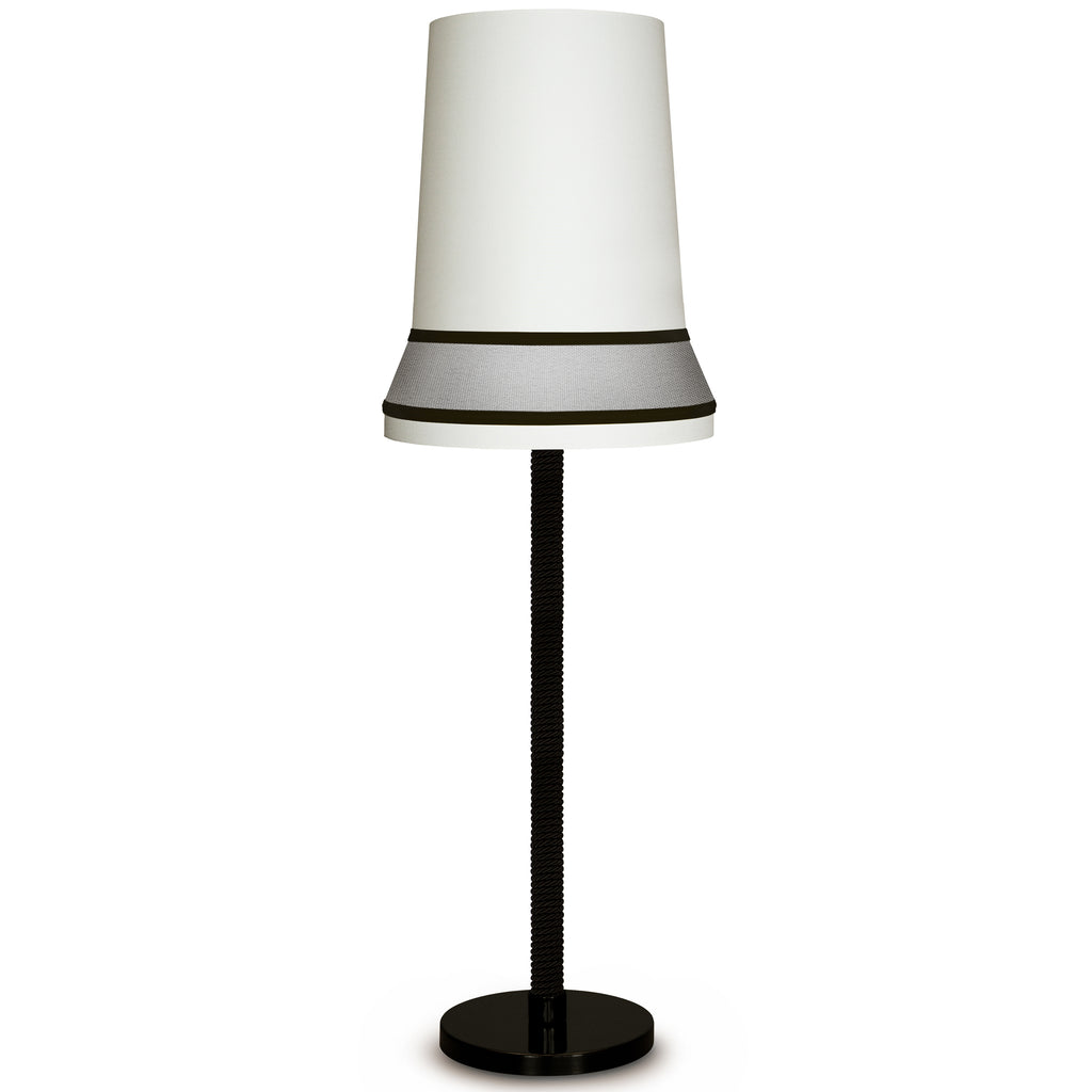 Iconic product inspired by the famous hat worn by Audrey Hepburn in the movie "Breakfast at Tiffany's". Designed for exclusive and elegant locations such as lobbies, boutiques, clubs, restaurants and also for classy residential environments. Audrey collection, composed by two table versions, the floor and the suspension versions, is designed as a true style exercise. There are three shades that join together: the cotton on the upper and lower part, Sale & pepe fabric on the central part and the black cotton trim. The stem is covered with a braided silk cord.