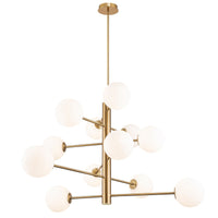 The Aurelia Collection is defined by its contemporary allure, featuring a warm brushed brass frame. Each arm of the chandelier is adorned with beautiful spherical white glassware, creating a visually striking contrast and emitting a soft, inviting illumination. This collection seamlessly marries sleek design with a warm aesthetic, making it a stylish and captivating addition to any space. 12 light chandelier shown. (height adjustable via extra rods included).