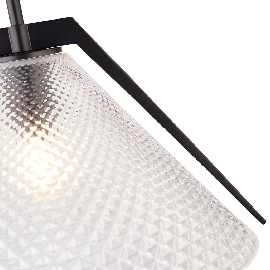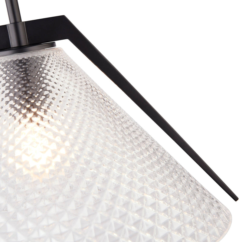 The Baltic Collection designed by Kevin Kraemer, features exquisite semi-transparent glassware with intricately etched diamond patterns, adding a touch of elegance to any table, island or bar. This single light pendant is shown in black and comes with extra rods for easy height adjustability. (Also available with brass framing).