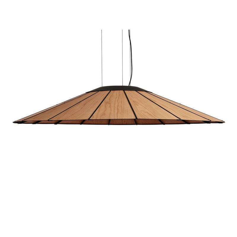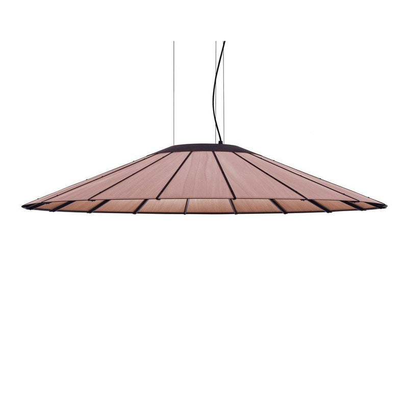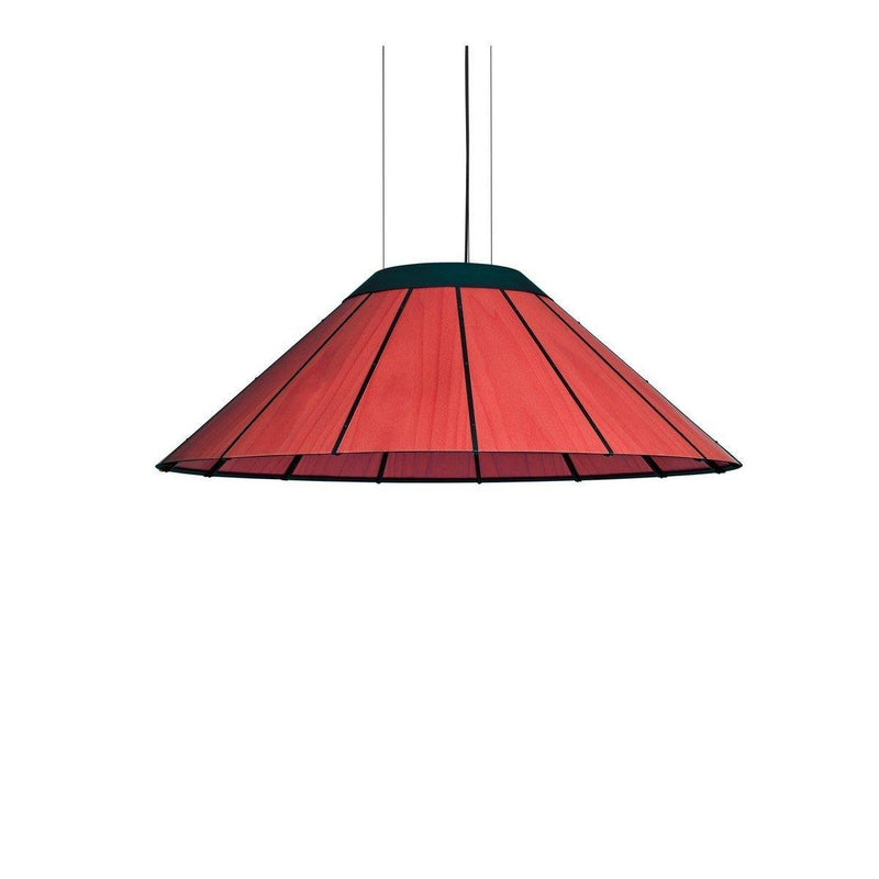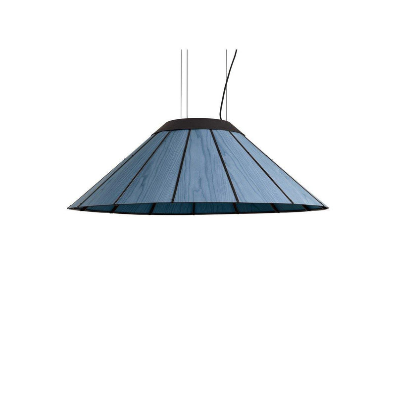 The Banga Pendant Lamp by LZF adds a honed grace to any space. Suspended from a round canopy by three wires, the shade of this light fixture is crafted from individual sheets of colored wood veneer that are attached together by metal strips. Lodged at the top of the shade is the LED light source, which is obscured by the acrylic diffuser. When illuminated, the lamp casts generous and direct light through the open base, while soft and ambient light is diffused through its shade for a pleasant effect. Available in a range of ivory white, yellow, orange, red, blue, grey, turquoise, chocolate, and pink colors, this ornate suspension is impeccable.