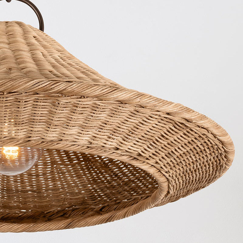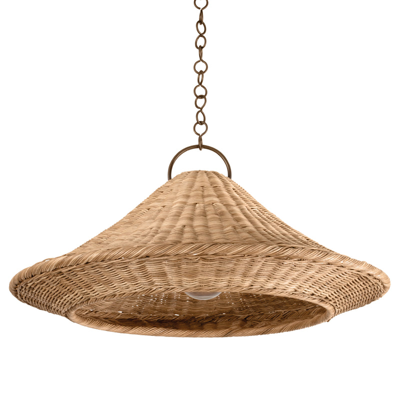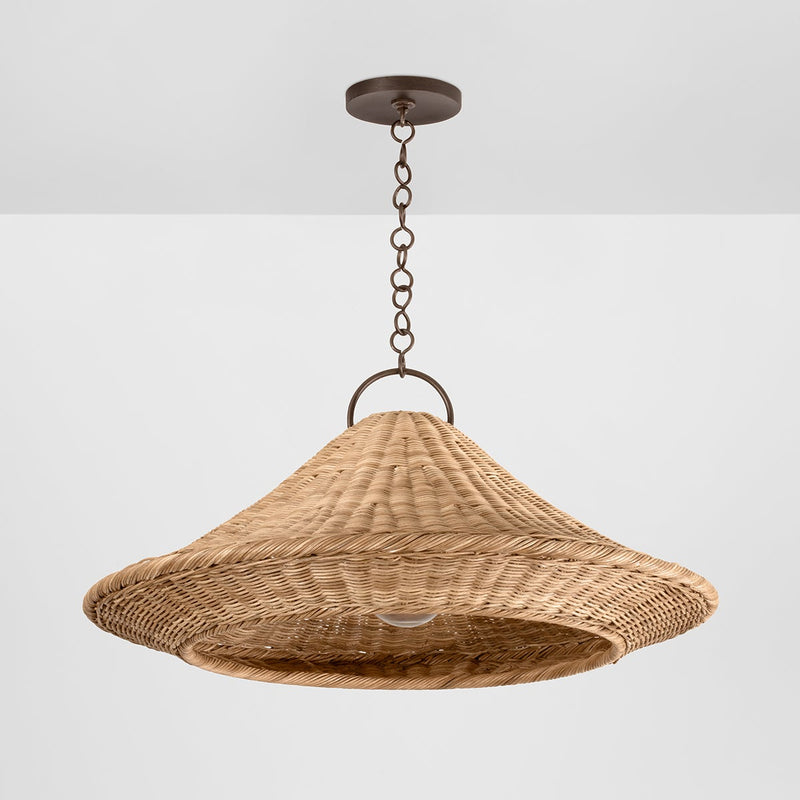 Inspired by the tranquility of the sea, this handwoven pendant light provides ambient illumination day and night. Combining rustic materials, a conical rattan shade is suspended from a large Bronze Leaf loop and chain. Serving as a powerful downlight, it brims with contemporary character and functionality. Baychester is available in two sizes to suit your space.