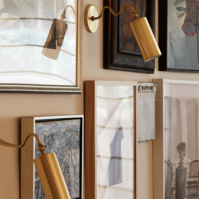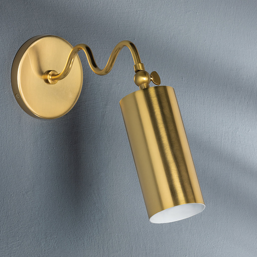 Chic and shiny, Bea adds a fun twist to traditional sconce design. An undulating arm in aged brass catches the eye and holds an adjustable cylindrical shade. This aged brass sconce is a smart and stylish choice for a gallery wall, open shelving, or a reading nook.