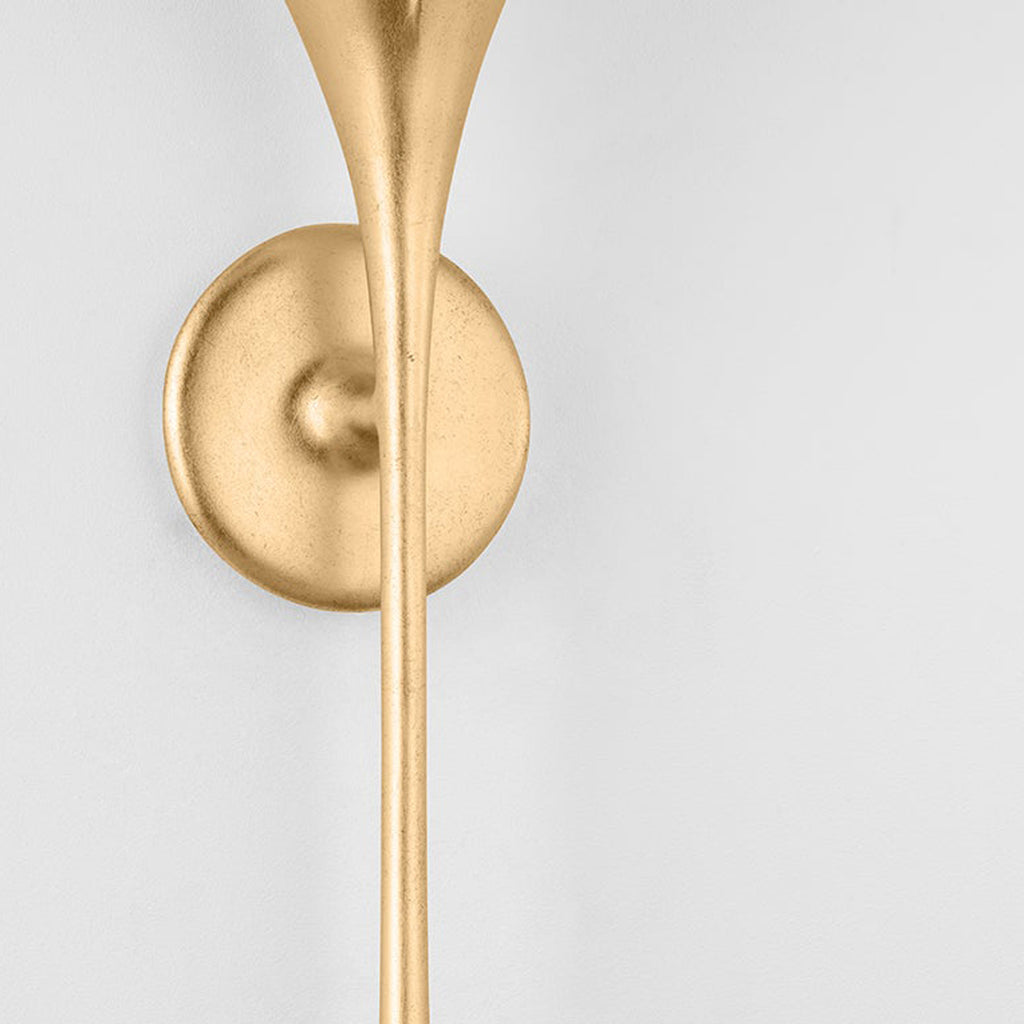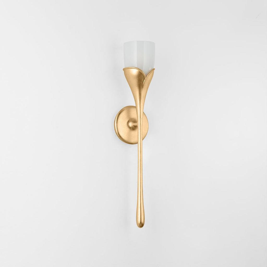Melding simplicity of form with a floral-inspired motif, this timeless sconce adds a romantic touch to small spaces. A single, slender stem crafted from Vintage Gold Leaf tapers gracefully at the center before opening into a bloom-like setting. Crafted from opaque, cloud glass, the shade gently glows when lit.