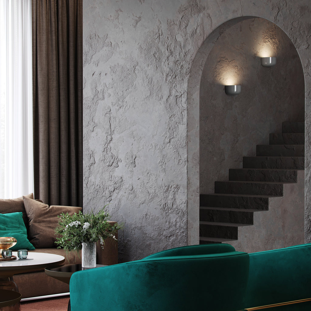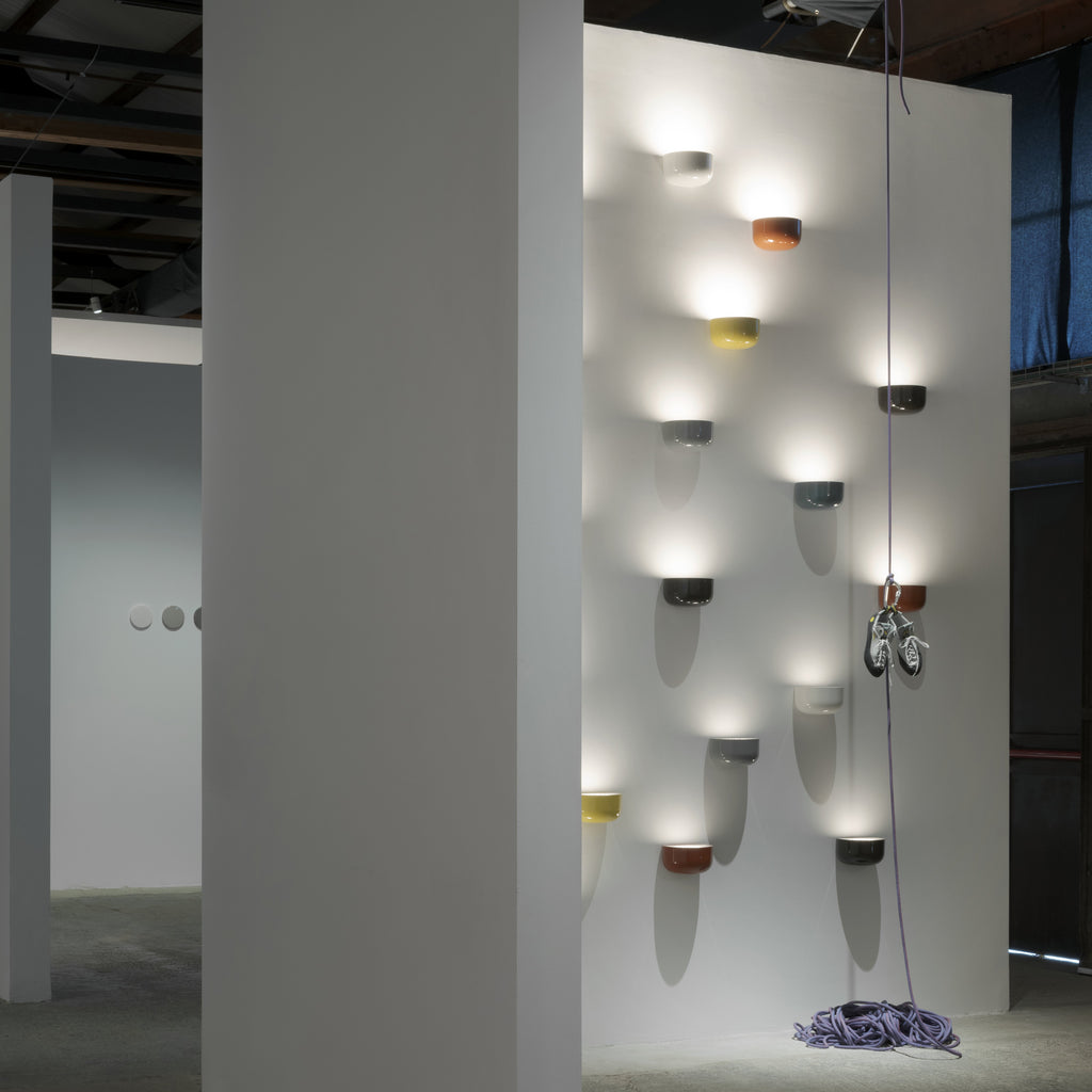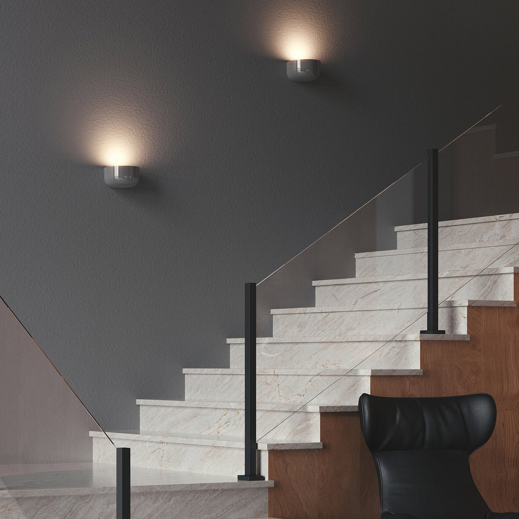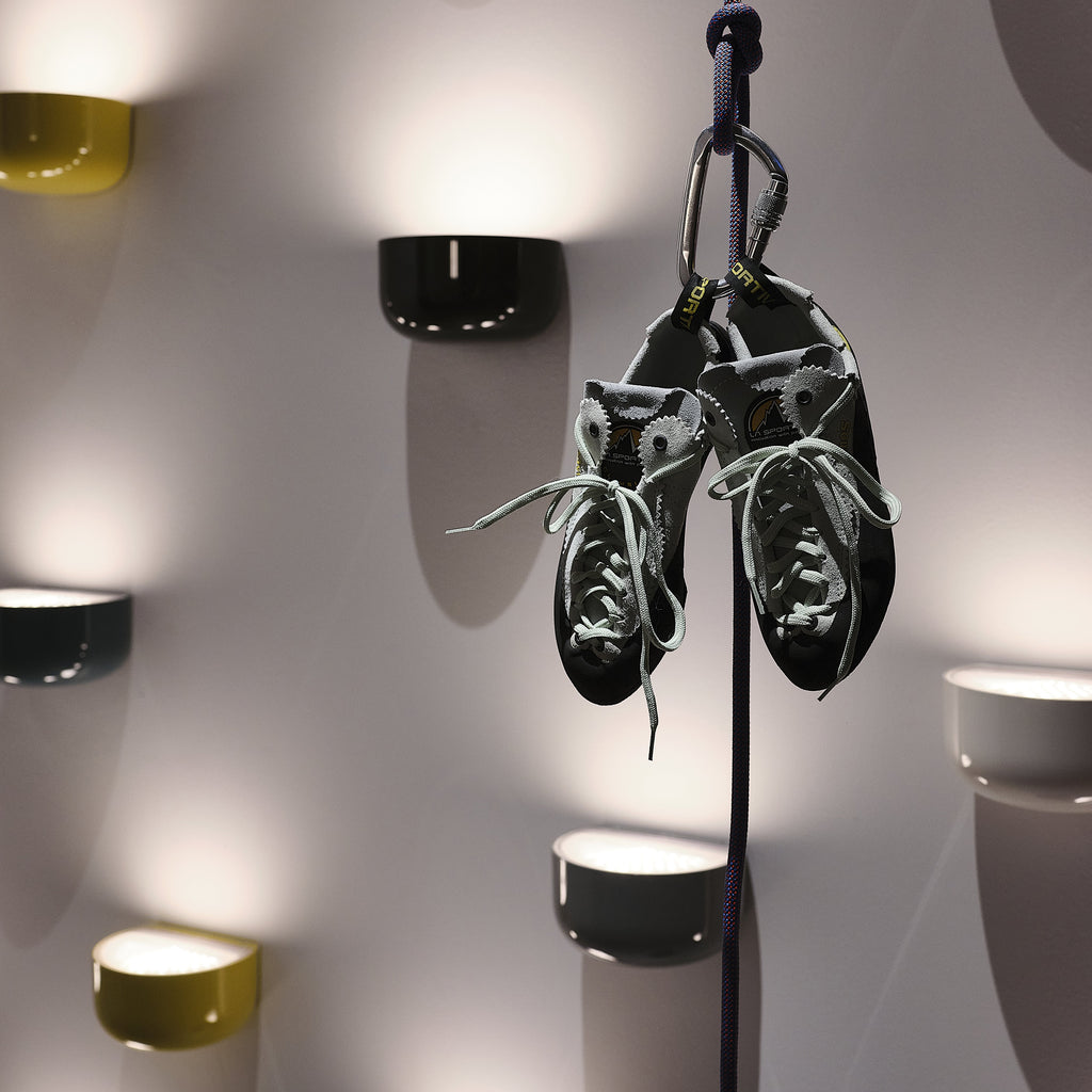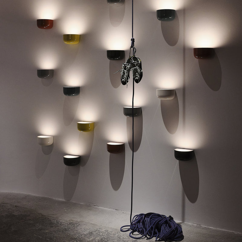 Designed by Edward Barber and Jay OsgerbyIndirect light wall lamp. Body in colored polycarbonate. Diffuser made of semi-transparent injection-moulded polycarbonate. The surface of the diffuser has been designed with a special texture to enhance the uniformity of the light distribution. High efficiency LED source with a lifetime of more than 50.000 hours. The LED source can be easily replaced on site by a professional installer when it comes to the end of its lifecycle. Bellhop Wall Up is a future-proof lamp as no glue is used to assemble its different parts. The product can therefore be separated, replaced individually, and recycled separately.