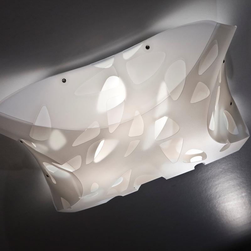 A perfect blend of art and design, the Bios Small Ceiling/Wall Lamp features a natural, star-shaped design. This linear lamp with tone-on-tone decoration comes constructed with two layers luminous Opalflex material. The body of this ceiling/wall lamp sports irregular holes just like the complex voids which are automatically present in many natural materials. Equipped with Magnetic System technology, the lamp creates suggestive shadows and reflections while allowing light to filter through its layers. The Bios Small Ceiling/Wall Lamp is available in White decor color and gives you the option to use an LED Filament or Halogen bulb.