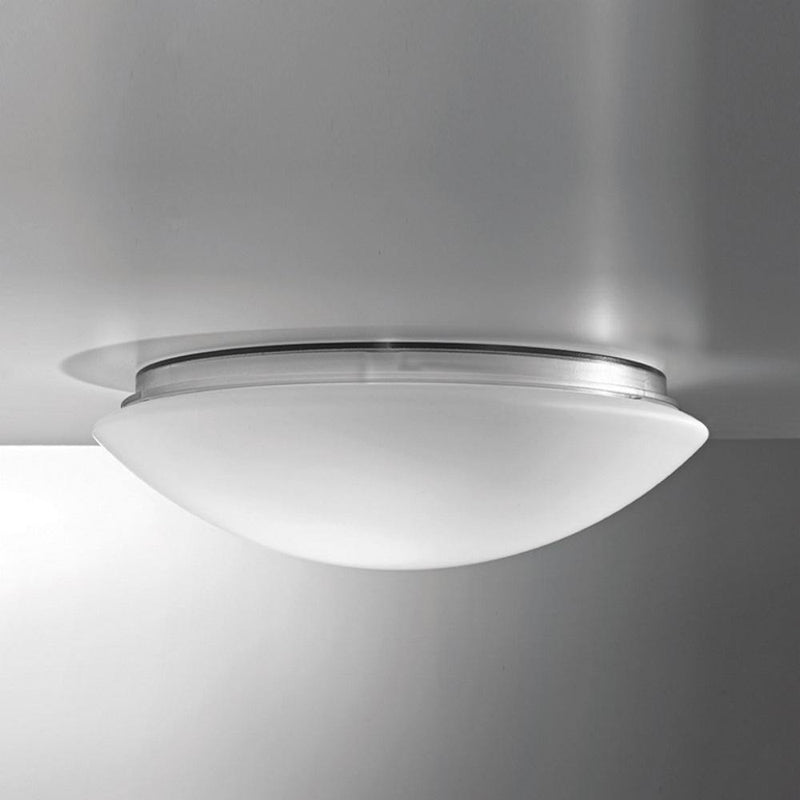 A collection of wall and ceiling lamps in satin finish triplex opal blown glass, with embossed aluminum flux recuperator, and a chlorine-resistant, anti-UV, neutral translucent polycarbonate base. Twist-lock system for the glass component. The Bis collection has IP44 protection, making it ideal for use in swimming pools and humid environments in general.