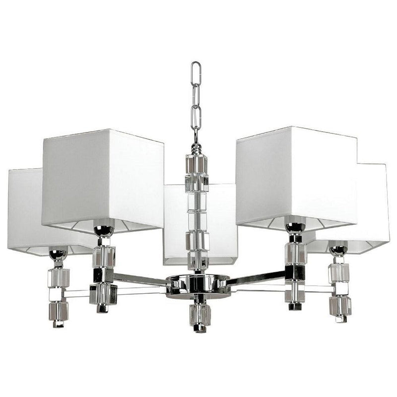 Add a contemporary flair to your living spaces with the smart and elegant Blocks 1712/5 Chandelier by Pedret. Featuring a design that draws its inspiration from classic geometrical forms, this classic Chandelier would sure be a graceful addition to any room decor. It consists of three metallic branches all in a single tier, which converges at a central metallic structure. Each of these metallic arms with contemporary styled motifs, hole cubical block-shaped lamps shade in white. The Blocks 1712/5 Chandelier is available in three finishes including Chrome, Titanium, and Gold. It can work with Incandescent bulbs or LEDs.