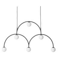 Graphic, energetic and with a youthful spring in its step, Bounce is a vibrant character. With a shape informed by the path the electricity will travel from lamp to lamp, Bounce is an expansive monochromatic piece that commands attention in any situation. The flat, screen-like luminaire fits especially well when positioned above oblong tables or counters; its opal glass casting a consistent, controlled light.