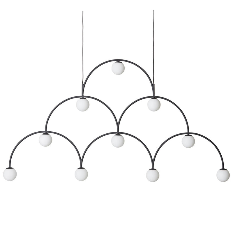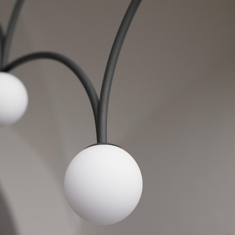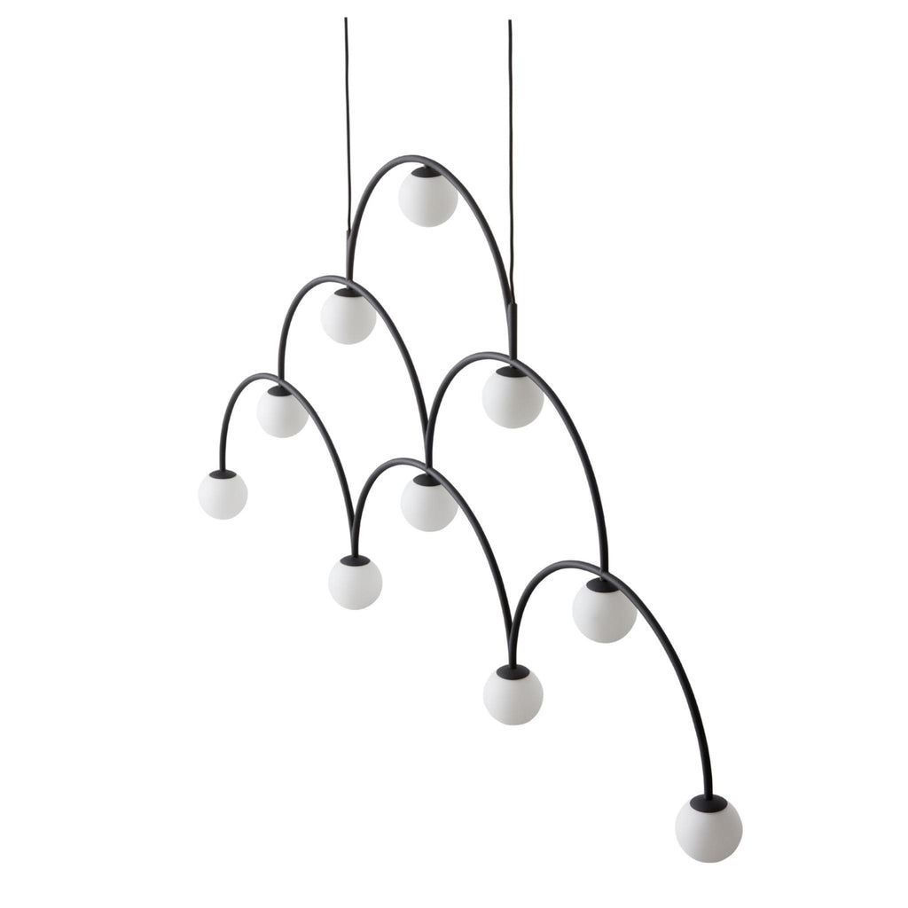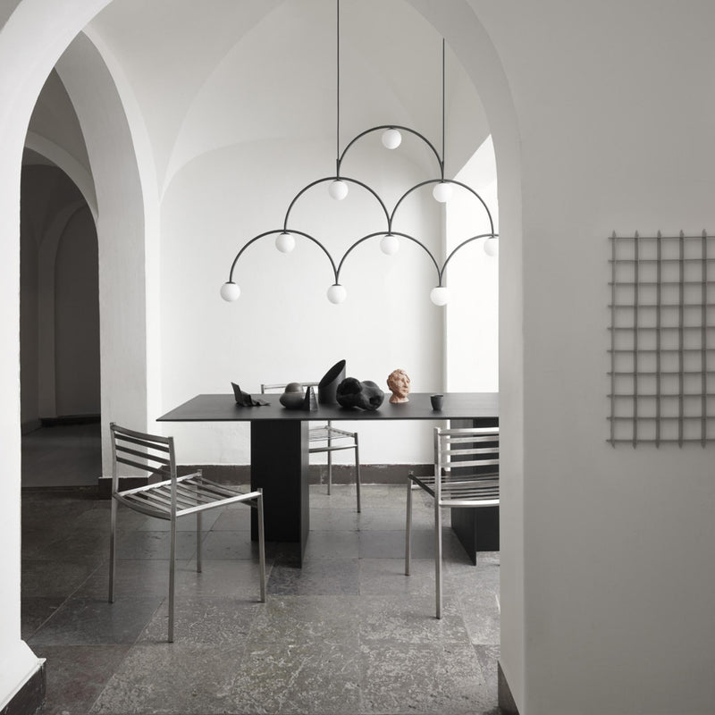 Graphic, energetic and with a youthful spring in its step, Bounce is a vibrant character. With a shape informed by the path the electricity will travel from lamp to lamp, Bounce is an expansive monochromatic piece that commands attention in any situation. The flat, screen-like luminaire fits especially well when positioned above oblong tables or counters; its opal glass casting a consistent, controlled light.