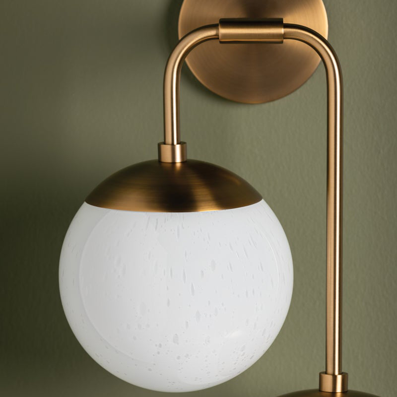 Taking cues from mid-century design aesthetics, Brogan elevates a simple silhouette with bold proportions. Supported by gracefully curved arms in a rich Patina Brass finish, two oversized Seedy Opal Glass globes are suspended at different levels. This versatile sconce offers flexibility at installation, enabling the piece to be positioned right or left by pivoting the arms relative to the backplate.