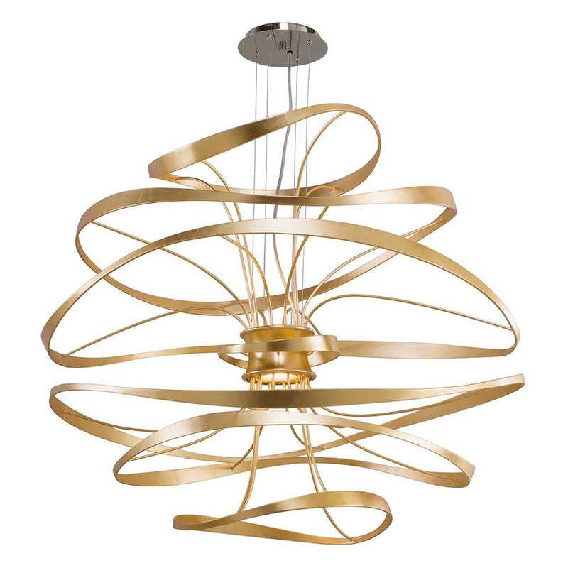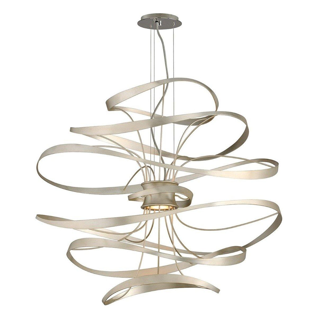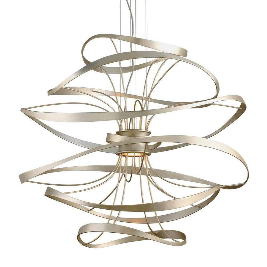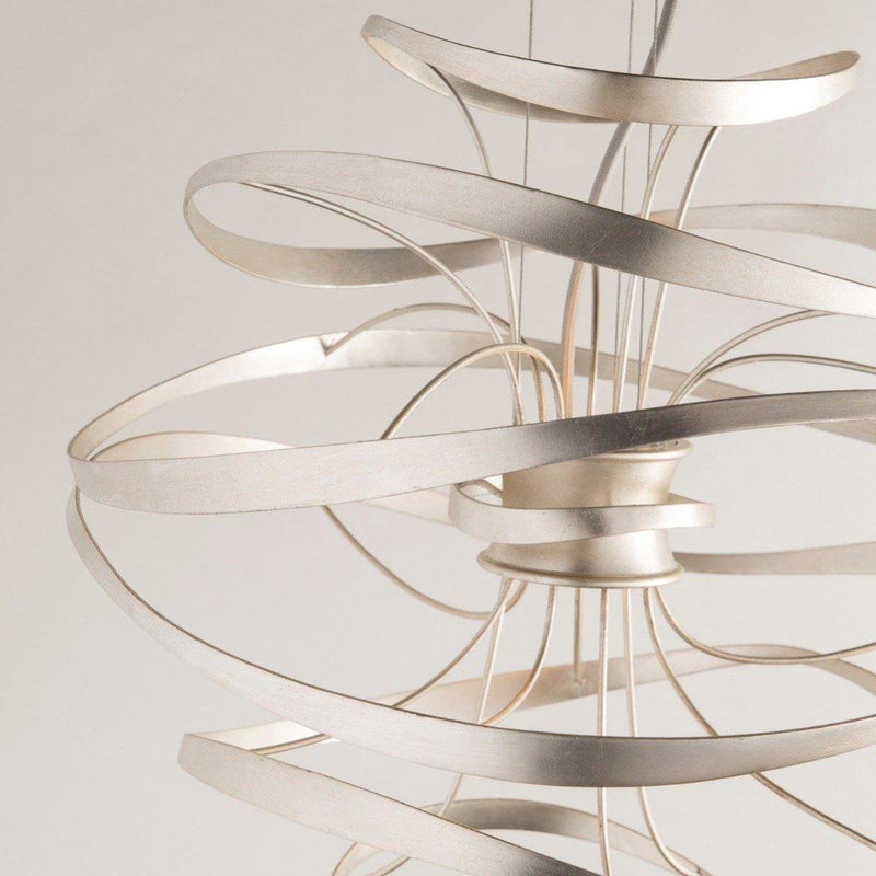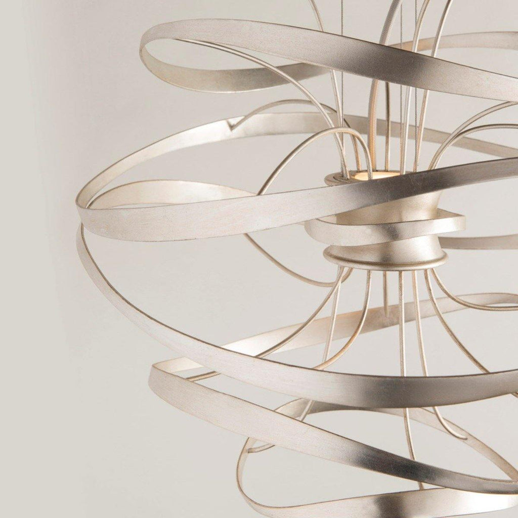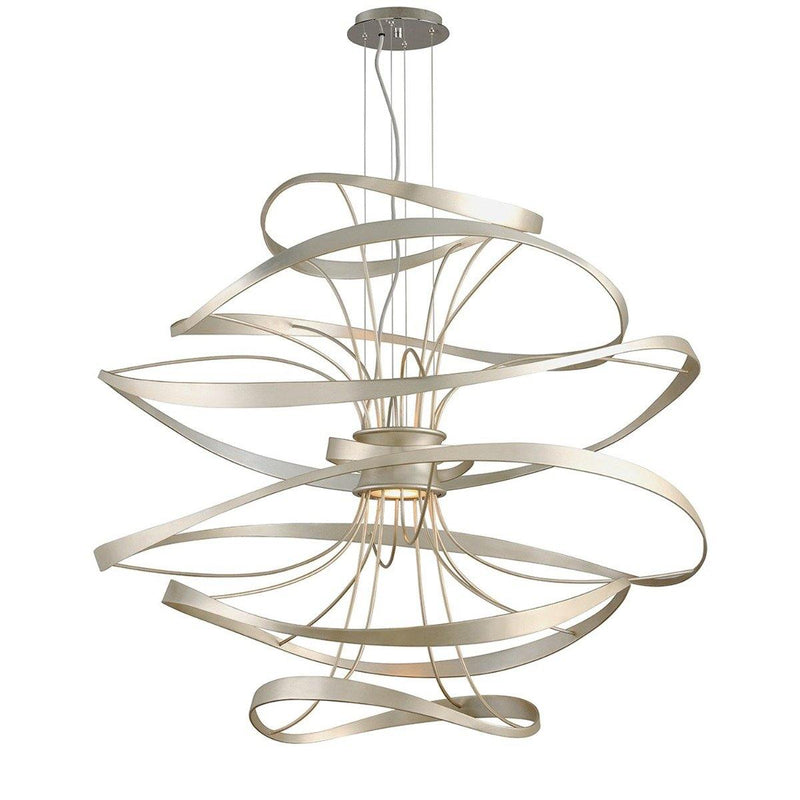 Adorn the walls of your place with the Calligraphy Chandelier by Corbett Lighting to evoke an artistic appeal. This chandelier showcases a swirling script designed with gold and silver leaf with polished stainless accents. When looked at from a distance, it looks like a script flowing through the page. At the center, it features two LED lights enclosed in floating bands. The thin, curving lines keep them in place while the fixture is installed on the ceiling. To match your lighting requirements, it comes in small, medium, large and extra-large sizes.