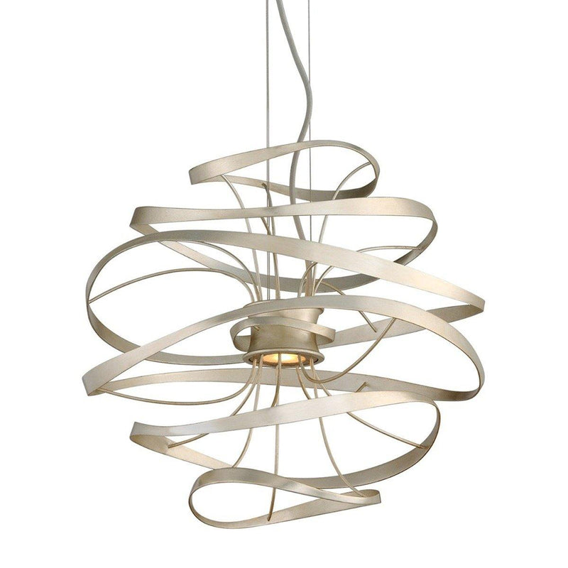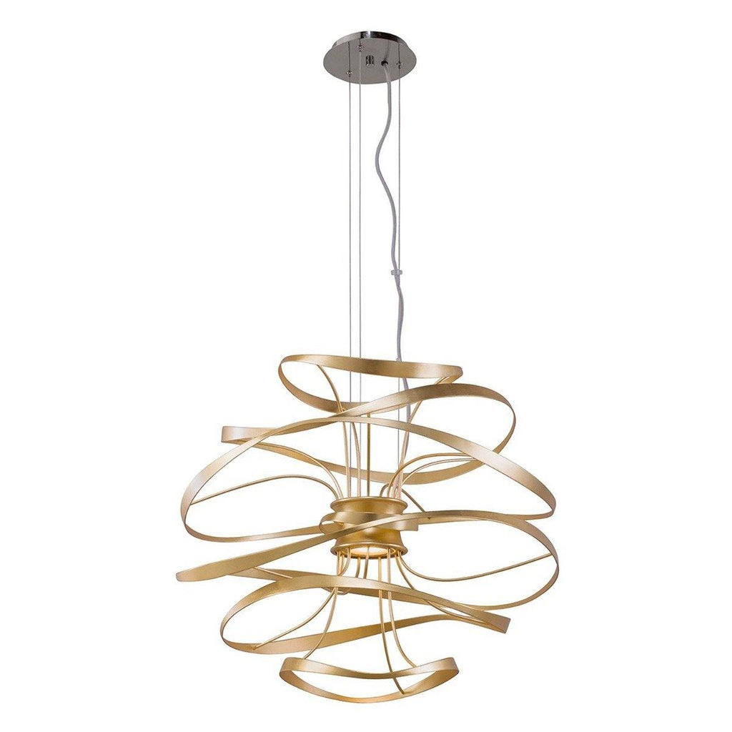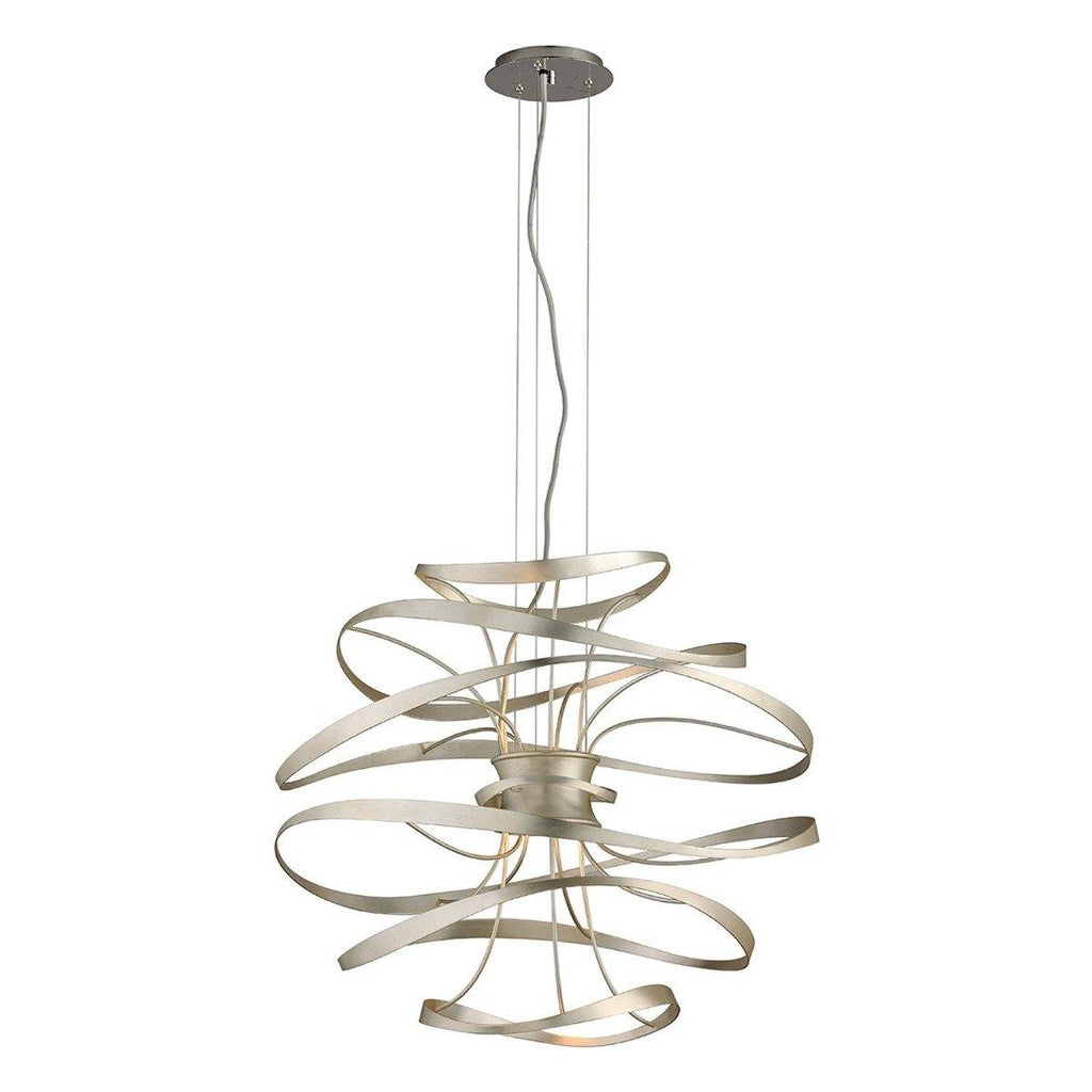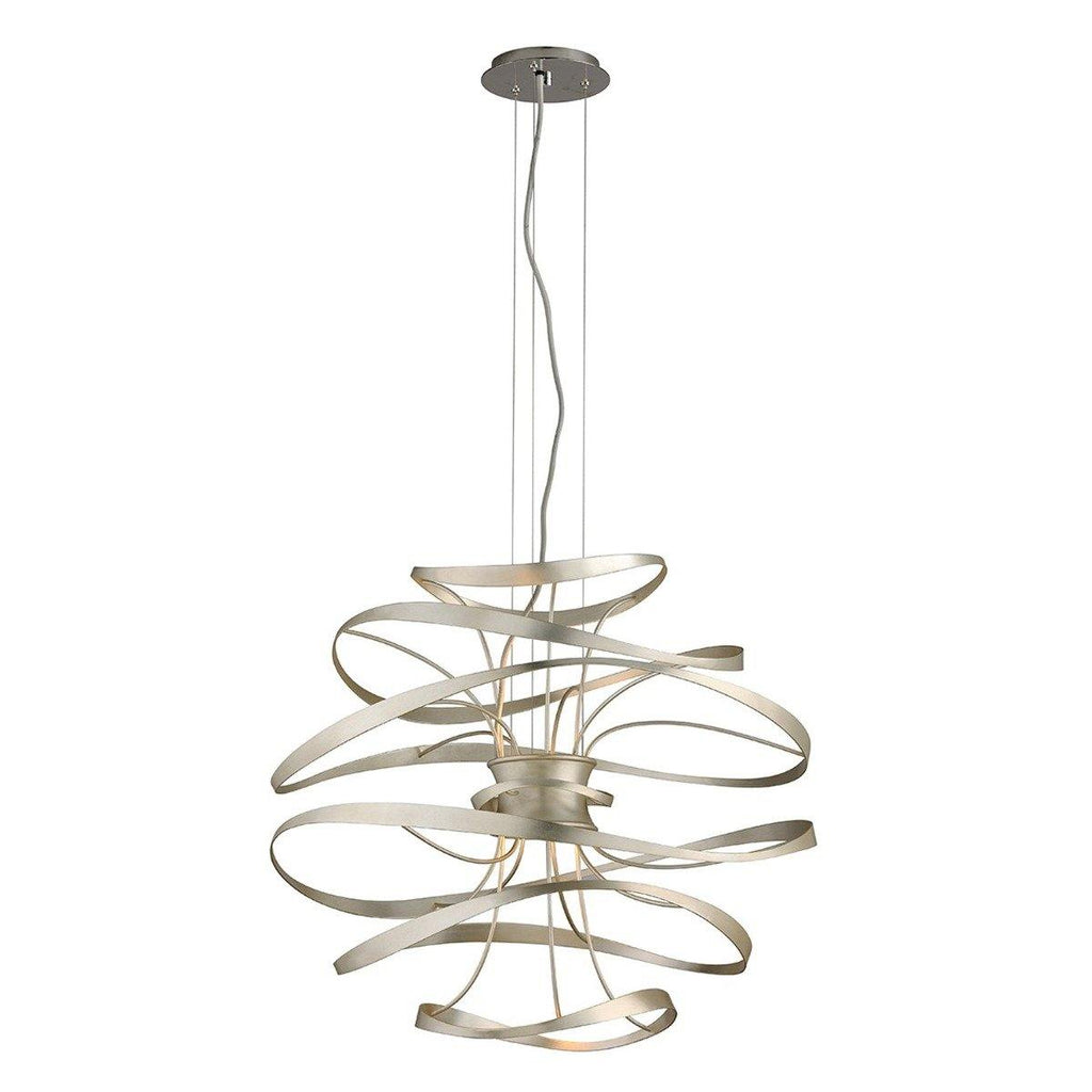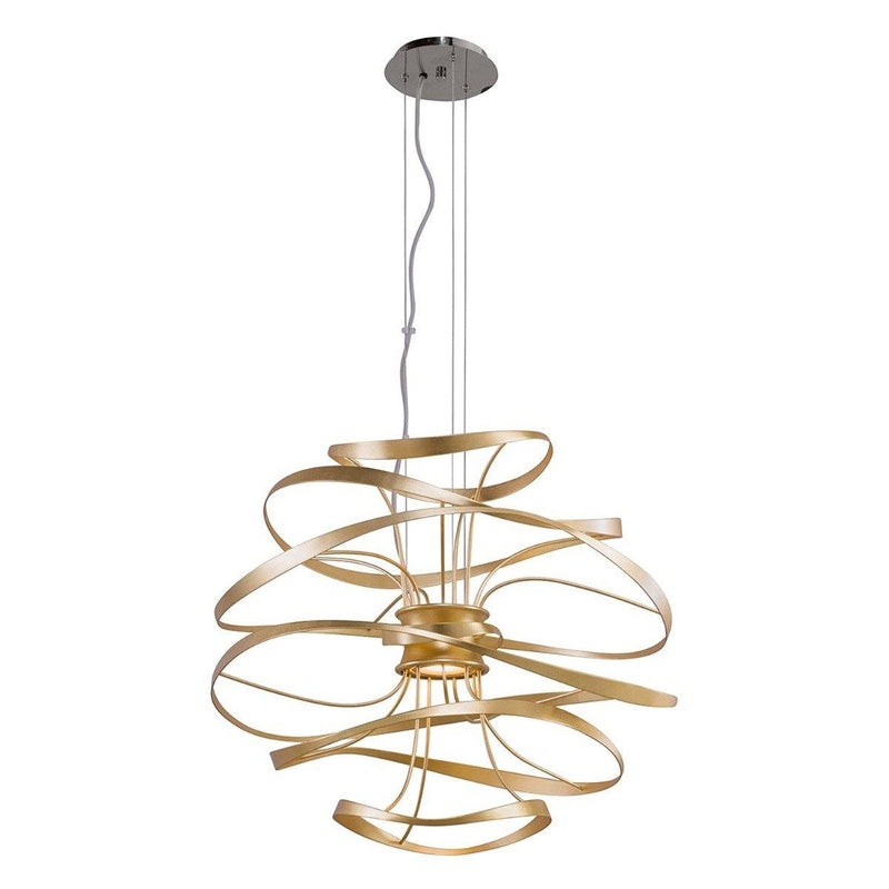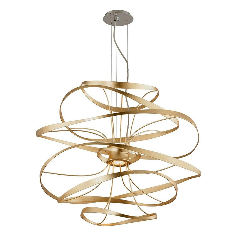 Adorn the walls of your place with the Calligraphy Chandelier by Corbett Lighting to evoke an artistic appeal. This chandelier showcases a swirling script designed with gold and silver leaf with polished stainless accents. When looked at from a distance, it looks like a script flowing through the page. At the center, it features two LED lights enclosed in floating bands. The thin, curving lines keep them in place while the fixture is installed on the ceiling. To match your lighting requirements, it comes in small, medium, large and extra-large sizes.