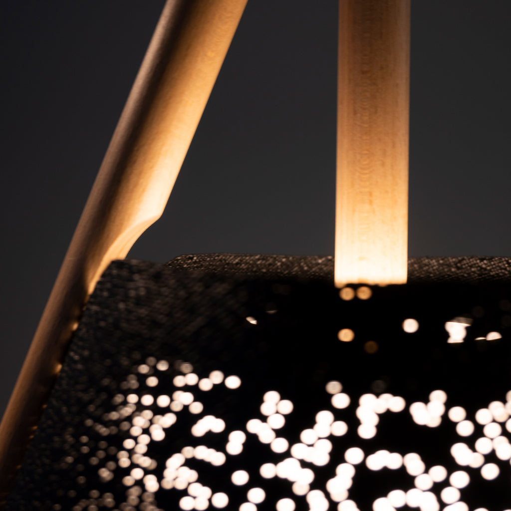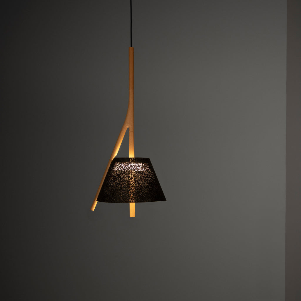 Cambo is the new design pendant lamp resulting from the collaboration with the cenlitrosmetrocadrado studio. The word Cambo (of Galician origin) refers to a wooden piece with a hook at one end, a handcrafted element present in the Galician tradition. With nature and our environment as inspiration, cenlitrosmetrocadrado has designed the Cambo system based on the natural growth of plants, the branching and bifurcation of trees. Ricardo Tubío and Xabier Rilo’s vision of the natural environment has given rise to a modular system that allows different designs to be configured with the same elements. Cambo is made of a beech wood structure with a water-based varnish that allows the material to be shown in its most natural form. With this peculiar structure, the painted stainless steel mesh is introduced into the lampshade which houses the integrated LED light source.