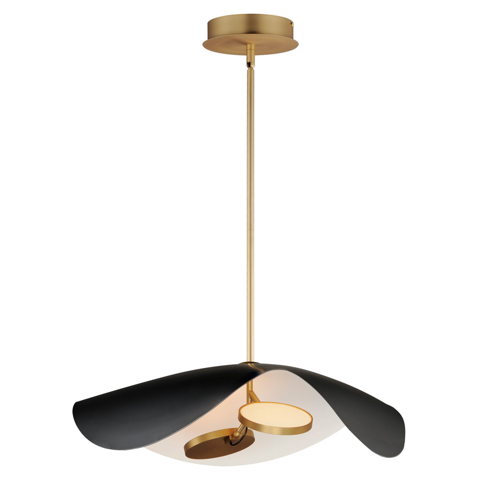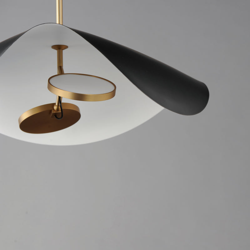 Poetic and organic in design, the undulating form of the metal shade appears to float effortlessly on a slender frame. Abstract discs of LED lighting are encased in round, adjustable heads so that the light can be directed upwards for indirect lighting reflected on the internal white painted face of the shade or the light sources can be rotated downward to provide bright illumination exactly where needed. The simple, sculptural form adds dimension in its scale evocative of a manta ray or the seductive quality of a woman wearing a large floppy hat.