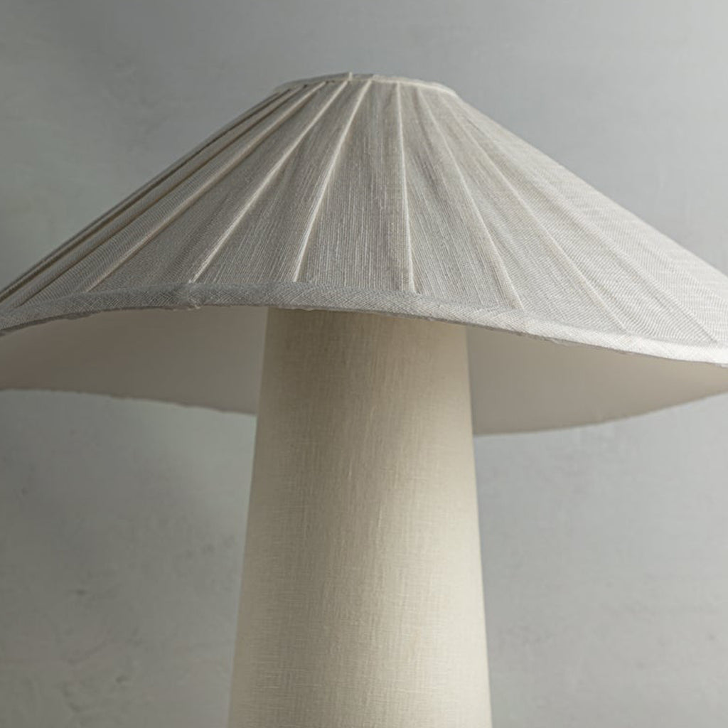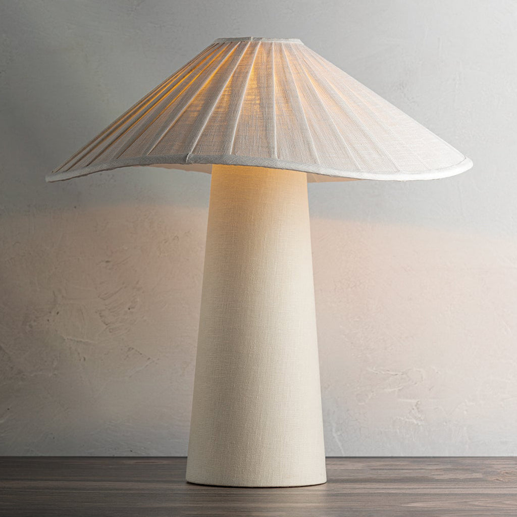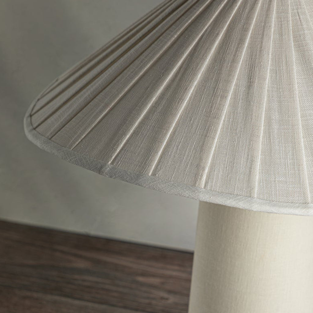Chanterelle's pleated natural linen shade feels soft and fresh and the undulating edge adds sophistication and movement. The tapered base is also wrapped in natural linen, creating an allover linen materiality and clean monochromatic palette that makes this modern organic table lamp feel right on trend.