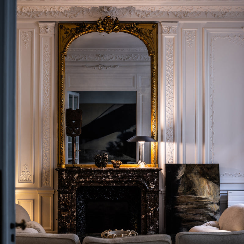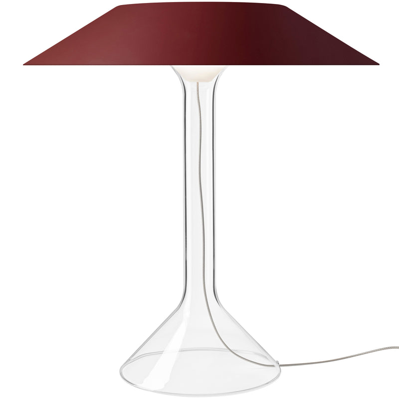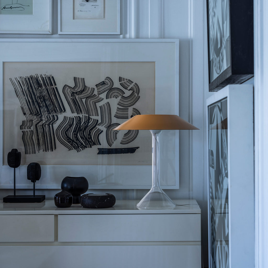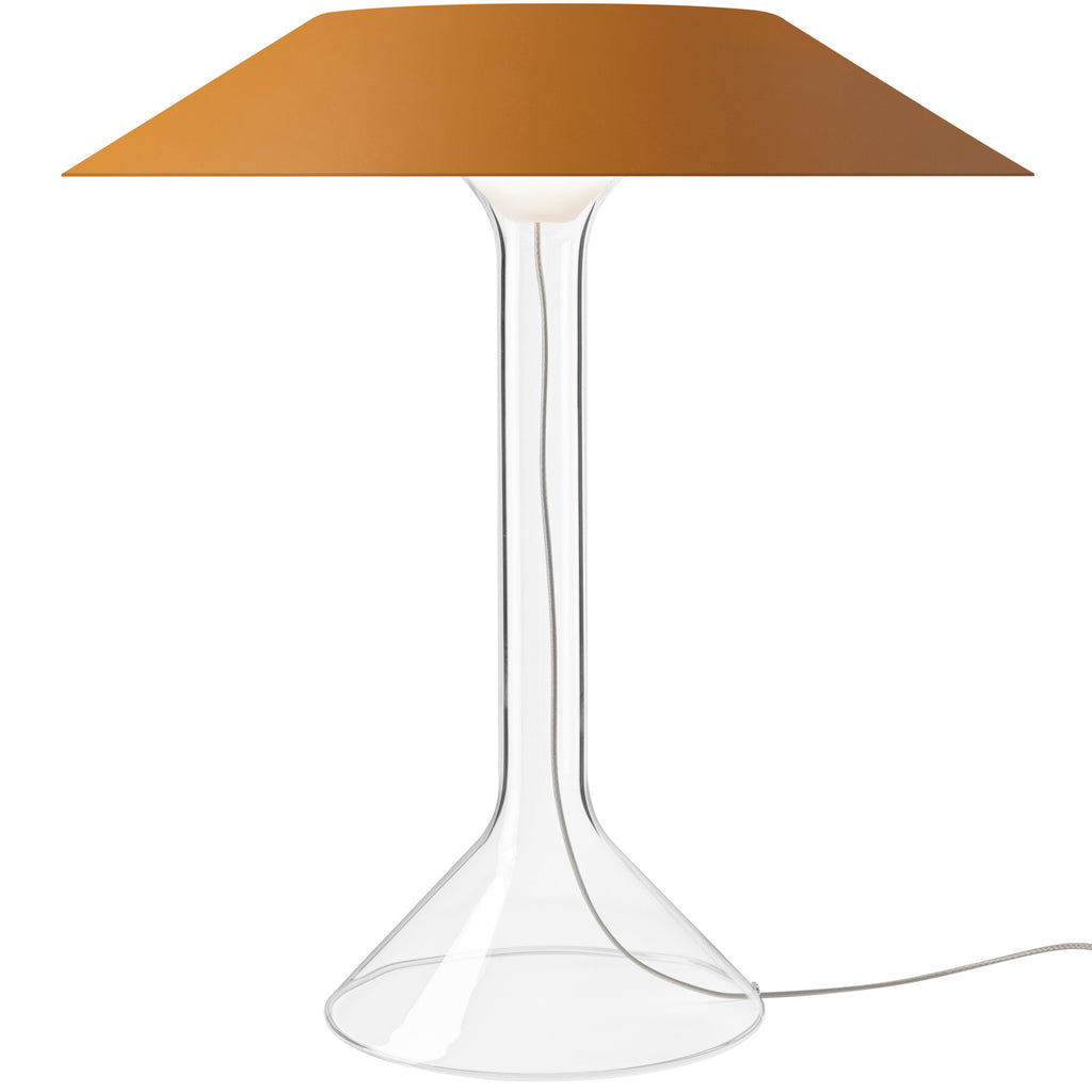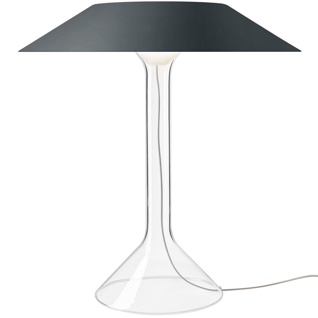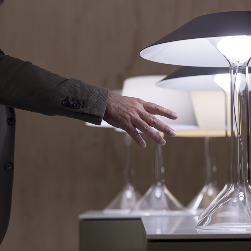 The Chapeaux M Table Lamp features a clear central body made of borosilicate glass with open ends, topped with a sleek steel hat shade. When the lamp is off, the transparent body almost vanishes, and reappears with a subtle presence when the light is on. An LED module sits inside the top of the glass, dispersing light radially through a polycarbonate shell to cast an intense yet soft glow onto your surfaces. The glossy white shade interior enhances light reflection. A refined and elegant lamp, capable of changing personality thanks to the hat it wears: three personalities, three atmospheres of light, three different ways of furnishing.