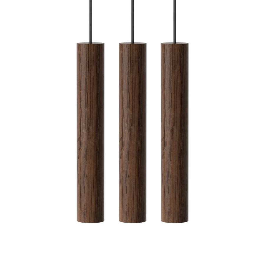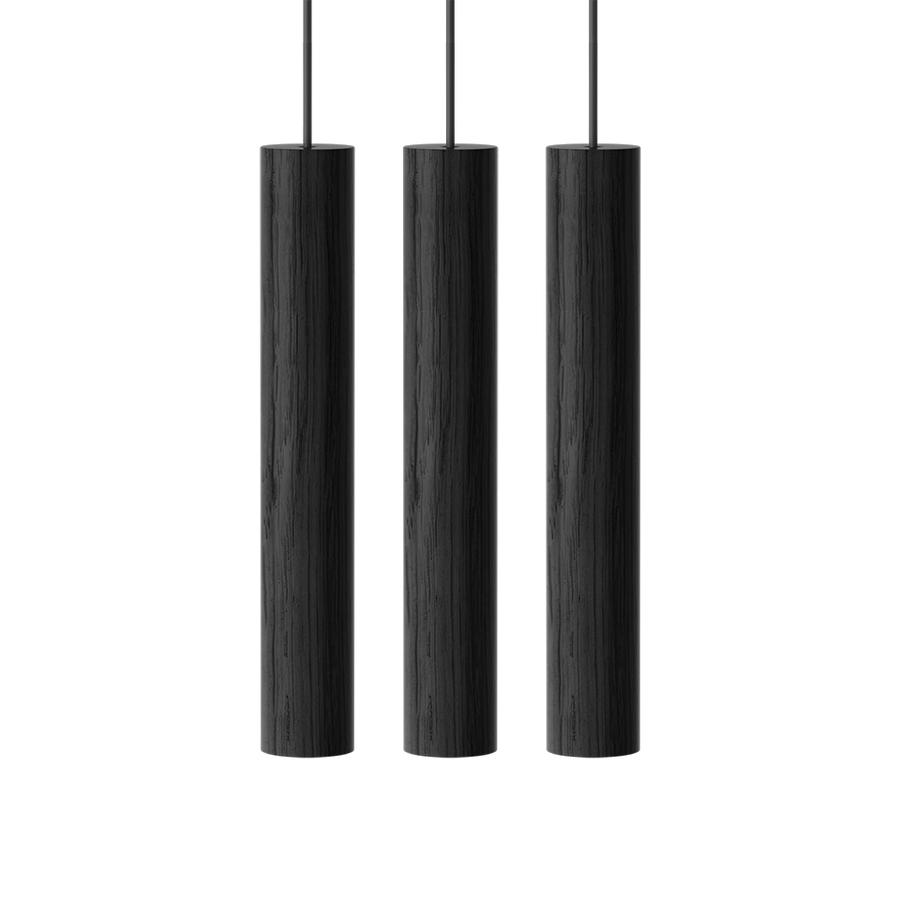 The Chimes lamp in a cluster model consisting of three Chimes hanging from a black metal canopy. The simple piece of solid oak infused with