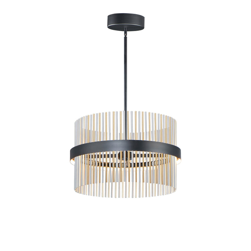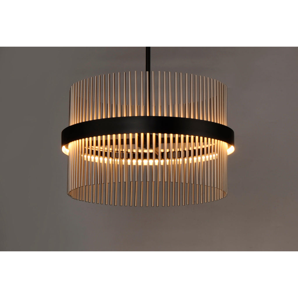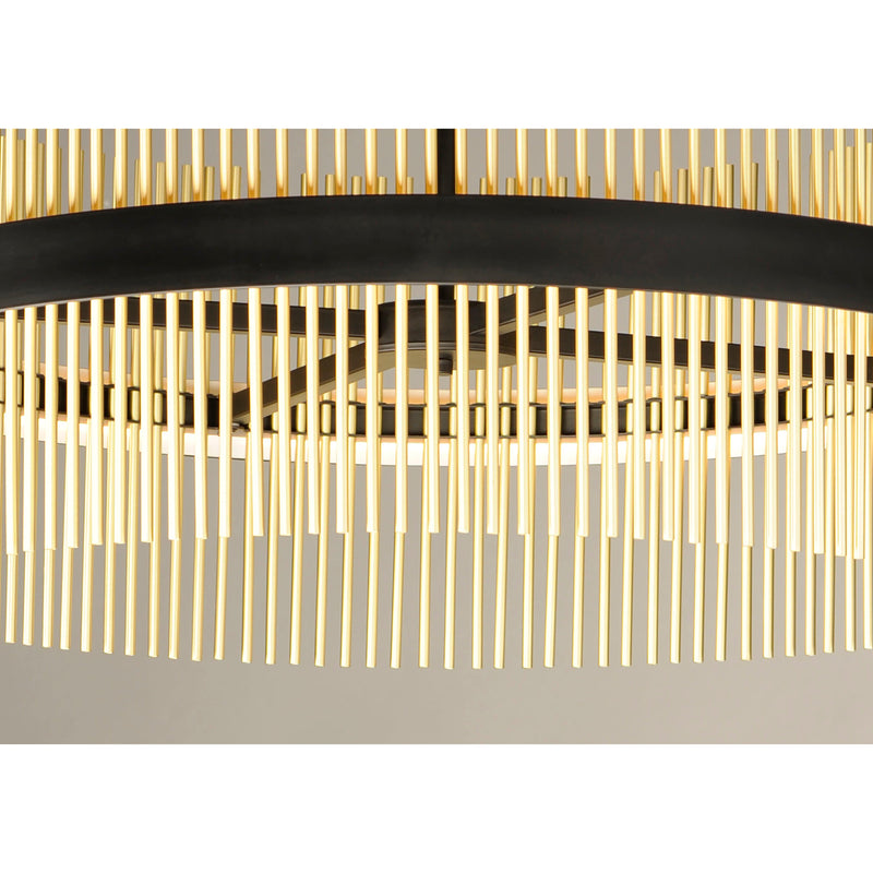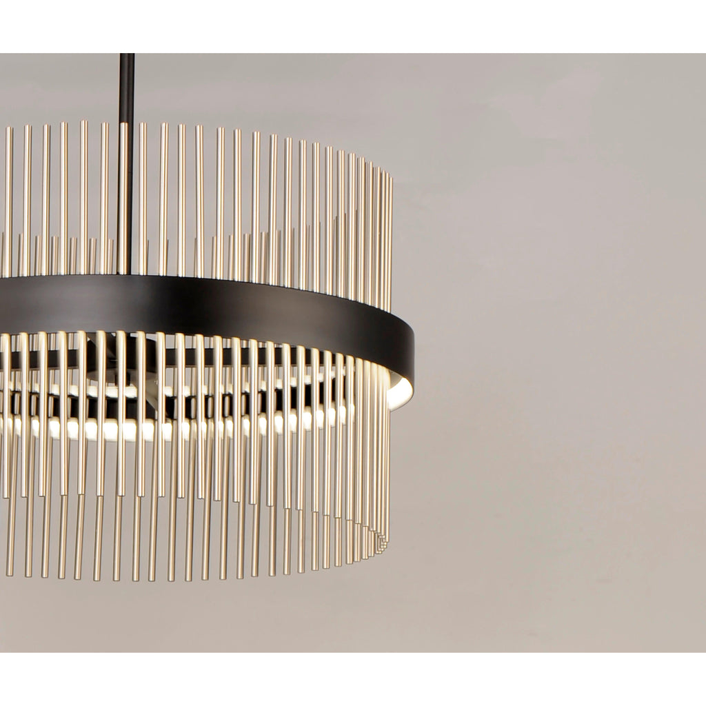 Wide bands of Matte Black metal supports an evenly spaced row of thin tubing finished in your choice of Satin Brass, Satin Nickel or a combination of the two. The stylish design is connected by WiZ that enables the lighting's White Ambiance between 2700-6400 Kelvin. Marvel at the ring's soft indirect lighting dispersion cast light both up and down and shine along the tubes aglow. Set daylight white options for concentration tasks and energize your body. Similarly take notice of the effect when setting a warmer tone at the end of the day or to add some ambiance.