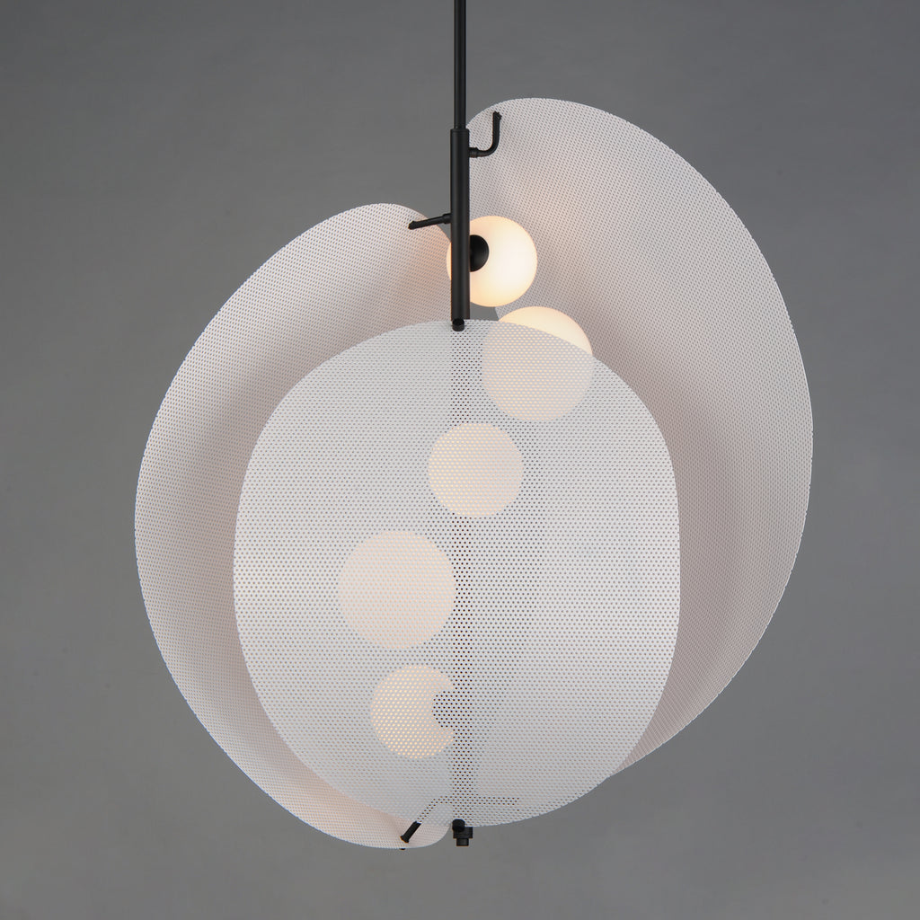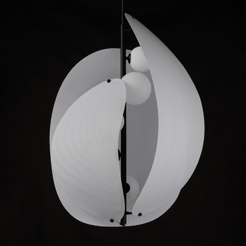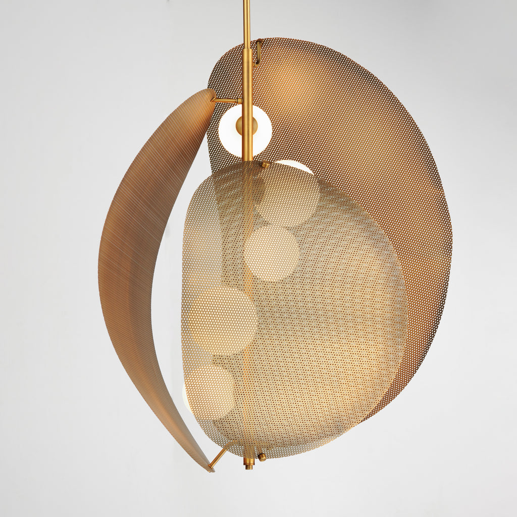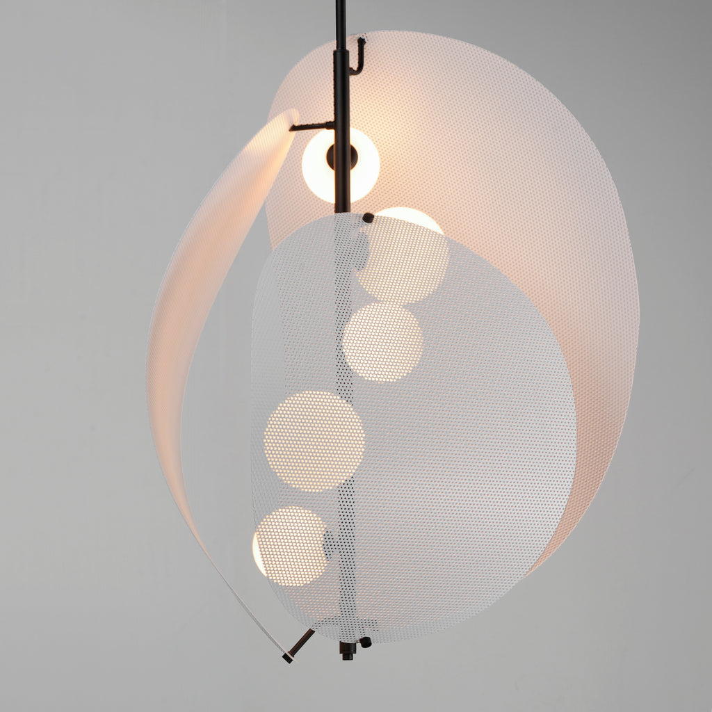 Thinly curved panels of perforated metal shades are illuminated by LED globes of Satin White glass at various positions along the span of the suspended chip-like sculptures. The expansiveness of the panels are voluminous, yet seemingly airy in their perforated translucence. Influenced by pop art and sculpture, the Chips are functional lighting products comically named to express some of the personality in Mat Sanders' designs. The collection includes large scale pendants vertically or horizontally suspended, smaller scaled single pendants, and wall sconces. The shade panels are available in Natural Aged Brass and Matte White, but they can also be manufactured in RAL finishes chosen by Mat Sanders to match other Studio M Lighting items. Additional finishes by request include neutral Taupe or Grey hues and more dramatic hues of Dark Slate, mellow Sage Green, and softer Dusty Blush. Make it monochromatic or combine the finishes to create an illuminated art piece that matches your space.