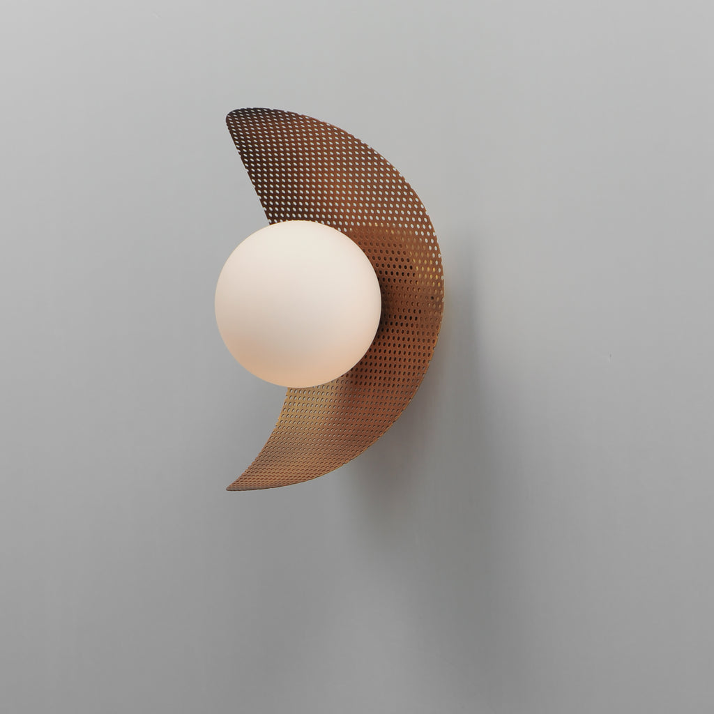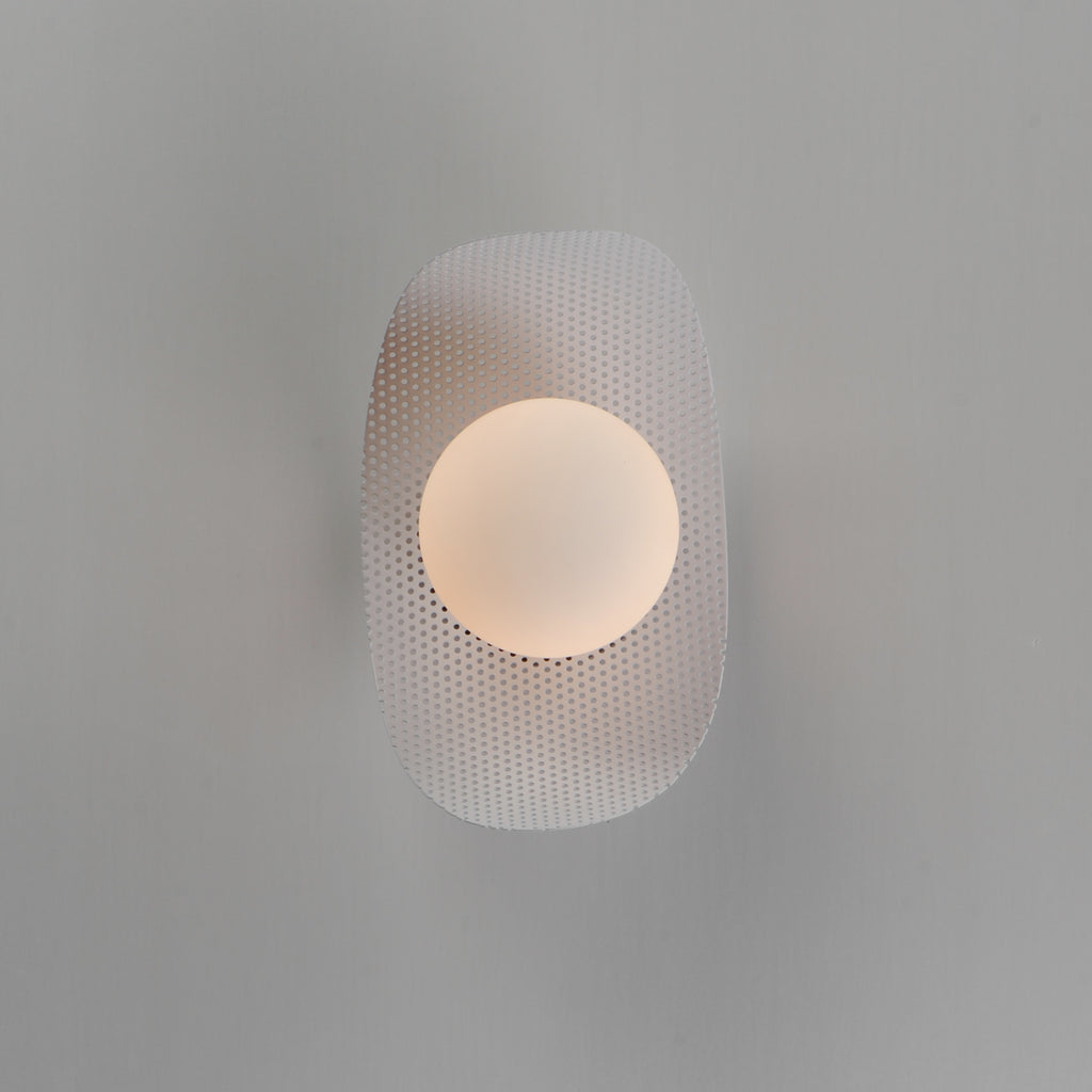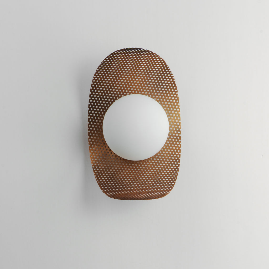 Thinly curved panels of perforated metal shades are illuminated by LED globes of Satin White glass at various positions along the span of the suspended chip-like sculptures. The expansiveness of the panels are voluminous, yet seemingly airy in their perforated translucence. Influenced by pop art and sculpture, the Chips are functional lighting products comically named to express some of the personality in Mat Sanders' designs. The collection includes large scale pendants vertically or horizontally suspended, smaller scaled single pendants, and wall sconces. The shade panels are available in Natural Aged Brass and Matte White, but they can also be manufactured in RAL finishes chosen by Mat Sanders to match other Studio M Lighting items. Additional finishes by request include neutral Taupe or Grey hues and more dramatic hues of Dark Slate, mellow Sage Green, and softer Dusty Blush. Make it monochromatic or combine the finishes to create an illuminated art piece that matches your space.